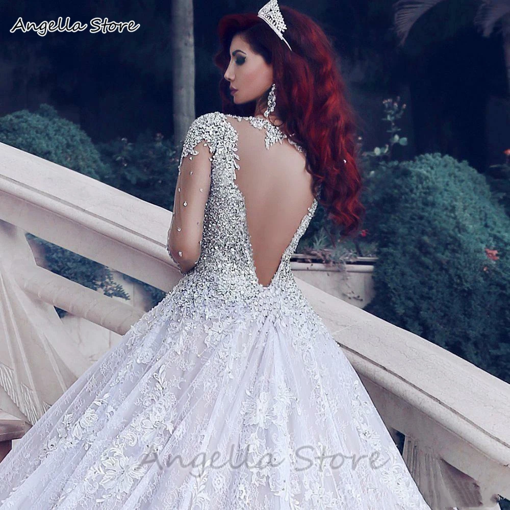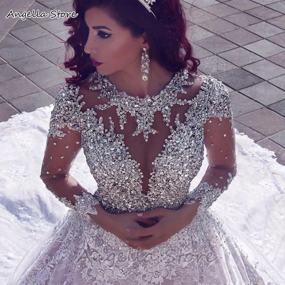 Кружевное свадебное платье со шлейфом, с длинными рукавами, с кристаллами и бусинами, винтажная свадебная одежда для невесты, 2021