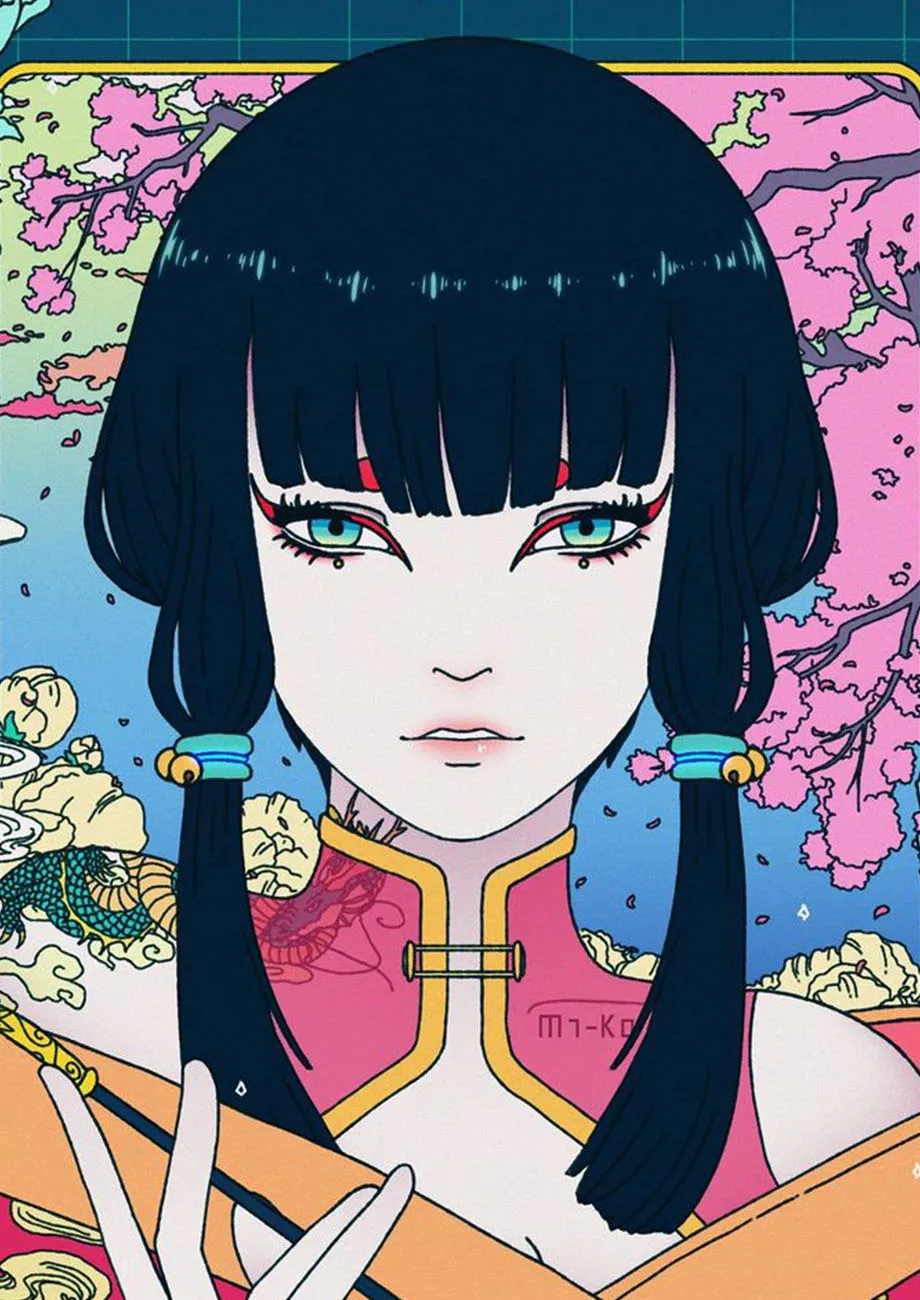 Аниме Ретро эстетический постер в стиле 80-х годов vaporwave, маска...