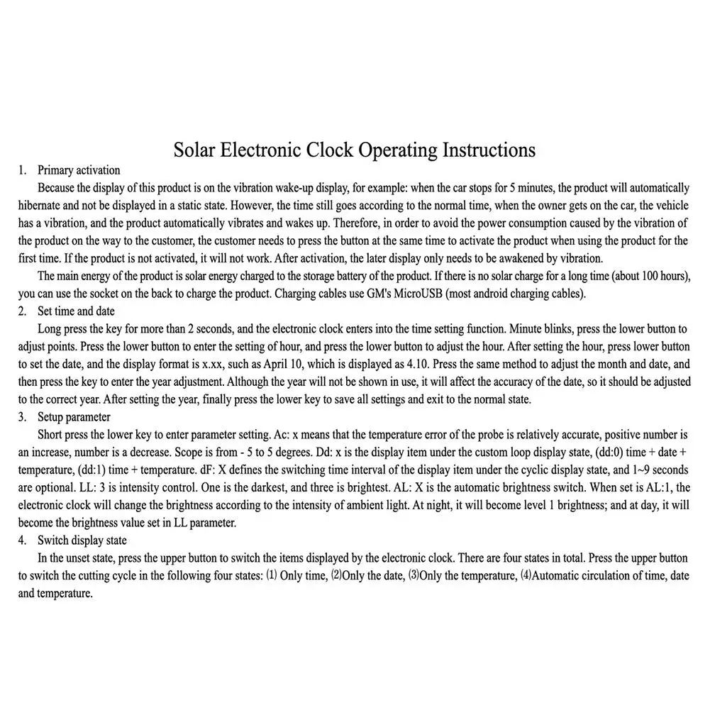 Двусторонняя лента: Двусторонняя лента использует высококачественную прозрачную, бесшовную двухстороннюю пленку, высокотемпературную стойкость и сильное сцепление. Он не повредит поверхность клея, не оставляет следов клея, а сама пленка не грязная и может быть повторно использована.Бесплатная проводка: Бесплатная проводка, без работы, источник питания от солнечной аккумуляторной батареи, Высококачественная солнечная панель и высокотемпературный источник питания от литиевой батареи, вставляется и фиксируется, не требуется проводка.Автоматическая регулировка яркости: высокотемпературный светодиодный дисплей с цифровой трубкой хорошо виден днем и ночью, с функцией автоматической регулировки яркости, мягкий в ночное время и под прямыми солнечными лучами.Micro USB зарядка: зарядный порт micro USB может использоваться в течение длительного времени в дождливые дни без солнечной энергии и может использоваться для зарядки на Android мобильный телефон. Встроенный температурный зонд может уменьшить ошибки при тестировании.Особенности:Часы, температура, день недели, дата, дисплей 4 в 1.В автомобиль с питанием от солнечных батарей часы могут только время отображения (24 часа системы), температура, даты и дня недели, а также может быть автоматически отображается с множественные функции не будут поочередно.Характеристики:Тип: Автомобильный цифровой термометрМатериал: АБС-пластикЦвет: черныйКоличество: 1Светильник цвета: белый, красный, синий, зеленыйСпособ зарядки: Солнечный/micro USBРазмеры: около 12,5*3 см/4,91*3,14 * 1.18inВес: около 80 г/2,82 унцийУпаковочный лист:1 * Солнечный Автомобильный цифровой термометр