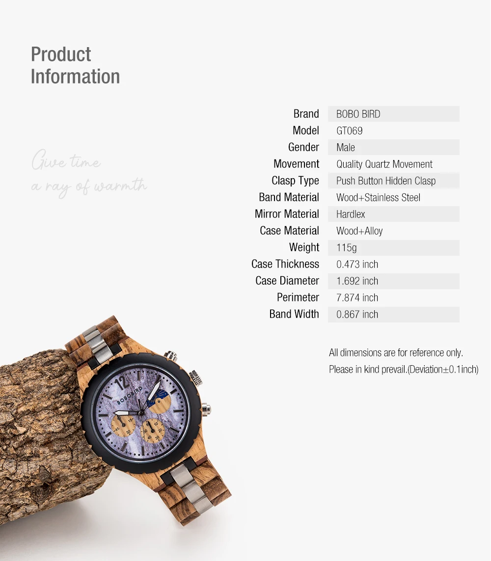Бренд: BOBO BIRDМодель: GT069Пол: мужчиныСтиль: Роскошная МодаОсобенность: дневной/Ночной индикатор хронографаЦвет: темно-красный, синий и белыйМеханизм: кварцевый механизмВес: 122 гПериметр: 200 ммМатериал корпуса: дерево и сплавВодонепроницаемый для повседневной жизни