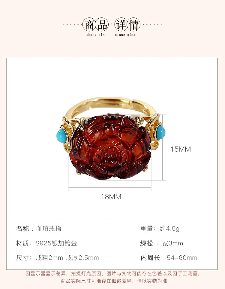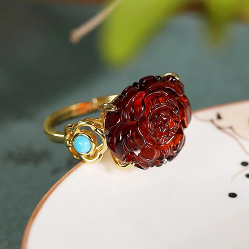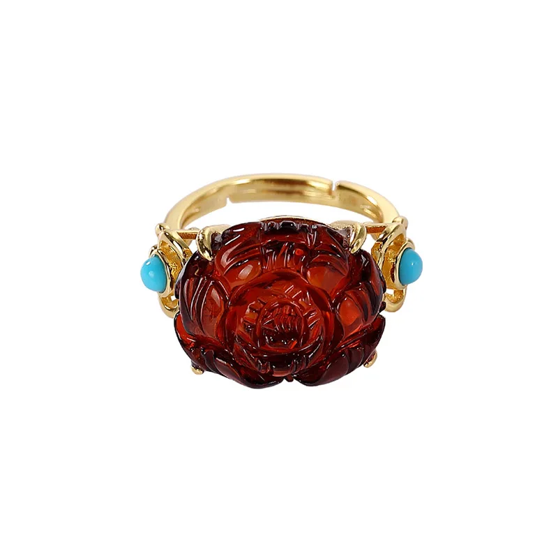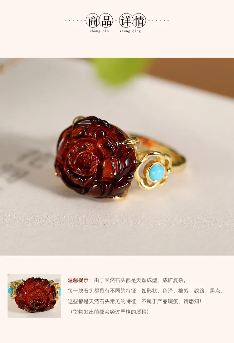 Новое позолоченное кольцо из стерлингового серебра S925 с натуральным красным камнем, янтарем, яркими цветами пиона, желтое регулируемое Открытое кольцо K0163