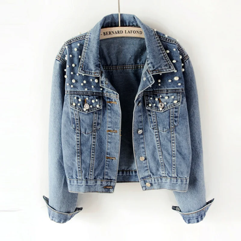 Женская джинсовая куртка 2021, женское Свободное пальто с бусинами ...