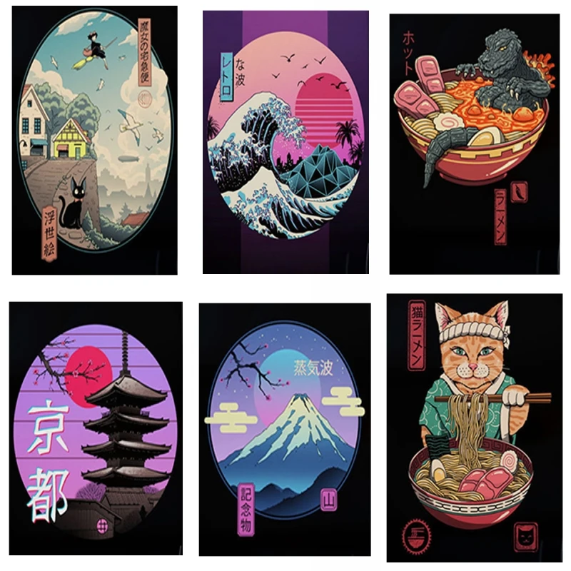 Японская кошка-Самурай, рамен, ностальгия, картины на холсте, мульт...