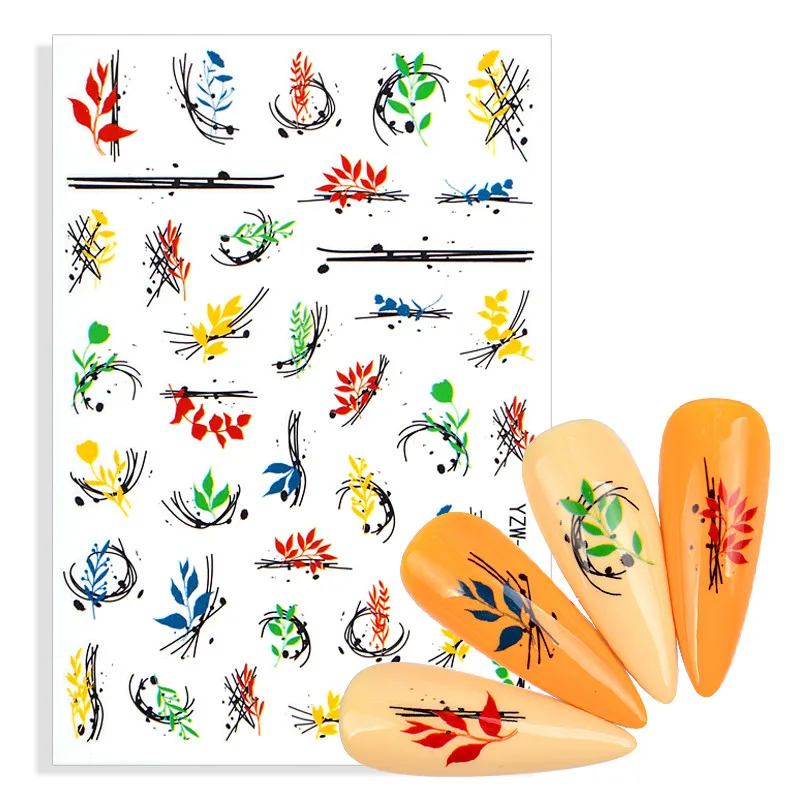 3D наклейки для ногтей, 1 лист, Черные Геометрические линии, листья...