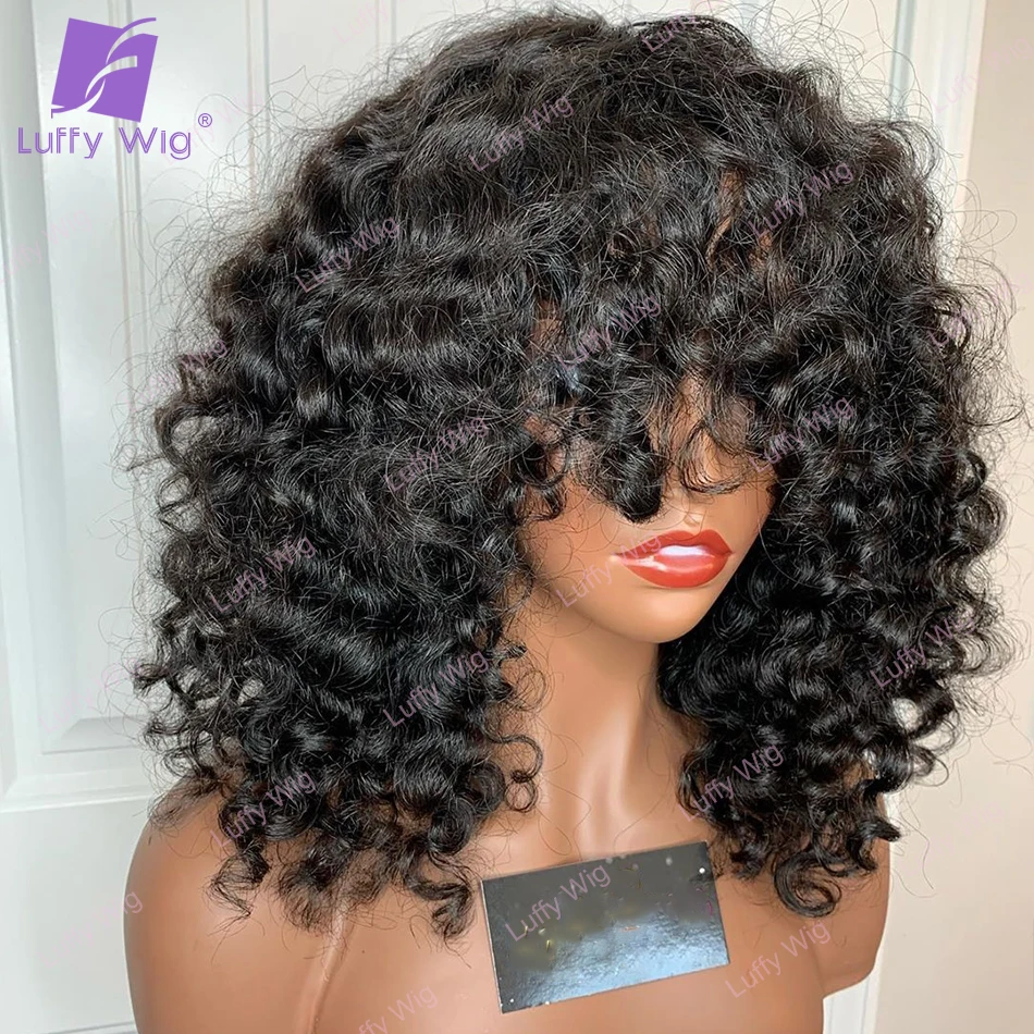 Парик из коротких вьющихся натуральных волос для чернокожих женщин, бразильские волосы Реми, без шнурка, кудрявый, Боб, с челкой, плотность 200, без клея