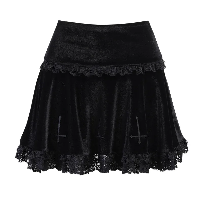 Женская бархатная юбка с оборками, винтажная юбка трапециевидной формы с кружевными краями в готическом стиле, Y2k
