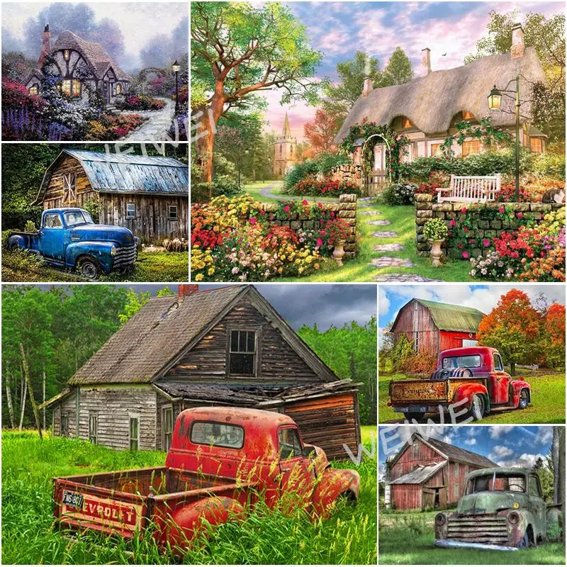 Набор для вышивки крестиком сделай сам, картина с изображением красивого сельского дома, винтажного автомобиля, алмазная вышивка, квадратные и круглые стразы