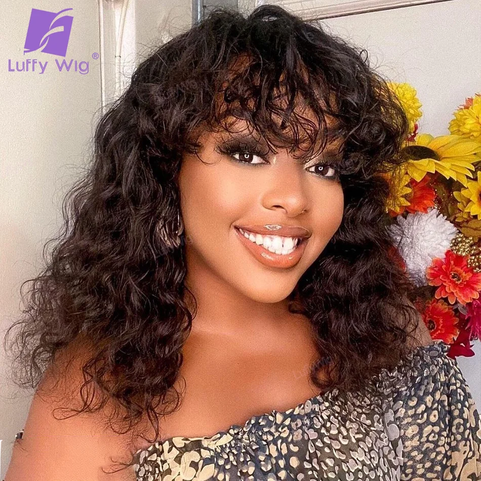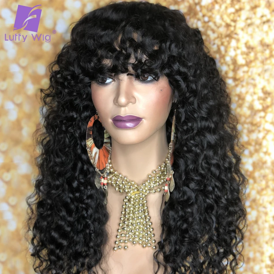 Парики из кудрявых человеческих волос с челкой, бразильские волосы без клея, машинная работа, парик для головы, 200 плотность, для черных женщин, Луффи