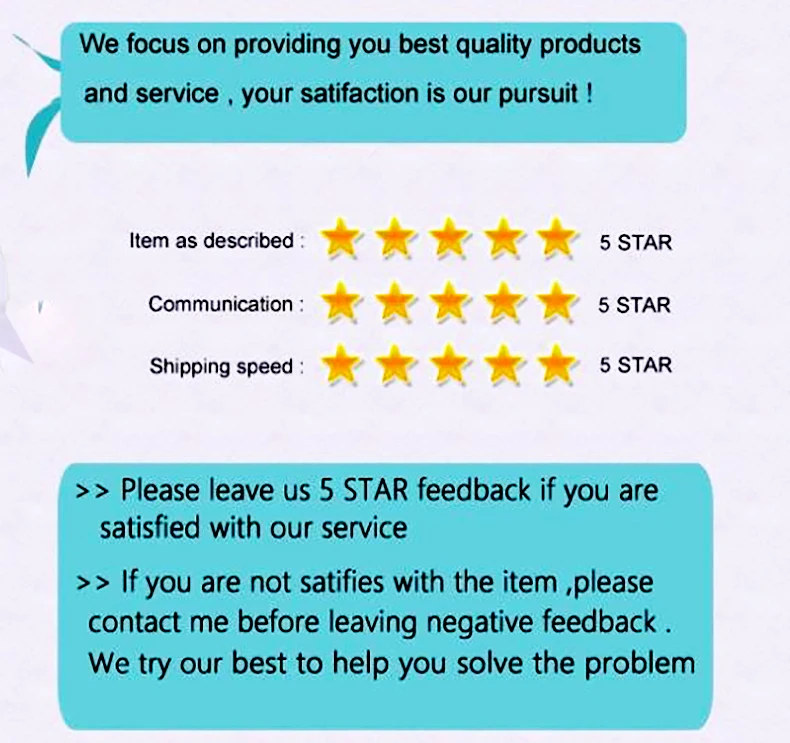 Ваше удовлетворение и положительные отзывы очень полезны для нас. Пожалуйста, оставьте положительные отзывы и 5 звезд, если вы удовлетворены нашими товарами и услугами. Если у вас есть какие-либо предложения с нашими товарами или услугами, пожалуйста, не стесняйтесь связаться с нами, прежде чем оставить отрицательный отзывы. Мы сделаем все возможное, чтобы решить любые проблемы и предоставить Вам лучшее обслуживание клиентов.
