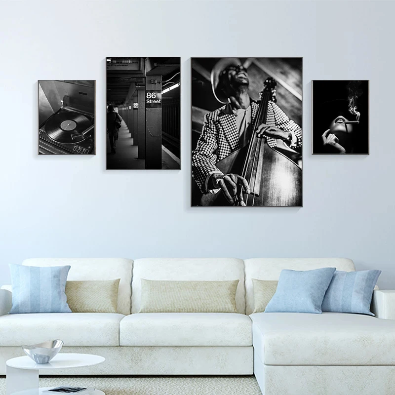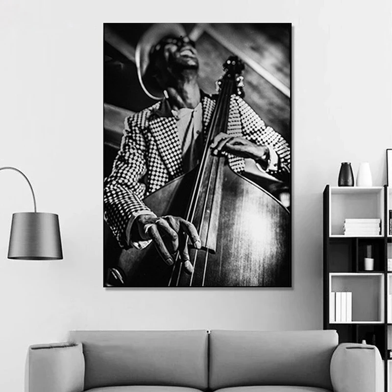 Черно-белый настенный плакат с принтом гитары, джаза, музыки, портр...