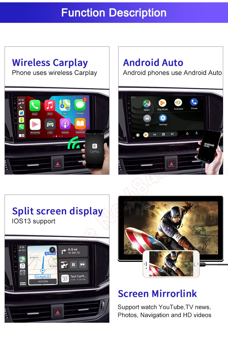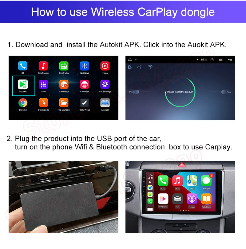 1. Установите приложение продукта на автомобильном хосте Android. 2. Вставьте продукт в usb-порт автомобильного хоста Android. 3. Подключите Bluetooth iPHone к Bluetooth продукта (iPhone также поддерживает usb-кабель); Телефоны Android все еще должны быть подключены через USB кабель (беспроводное соединение не поддерживается). 4. Автоматический экран будет интерфейсом CarPlay.