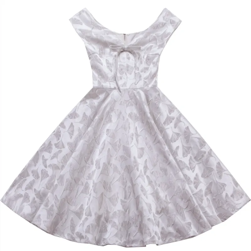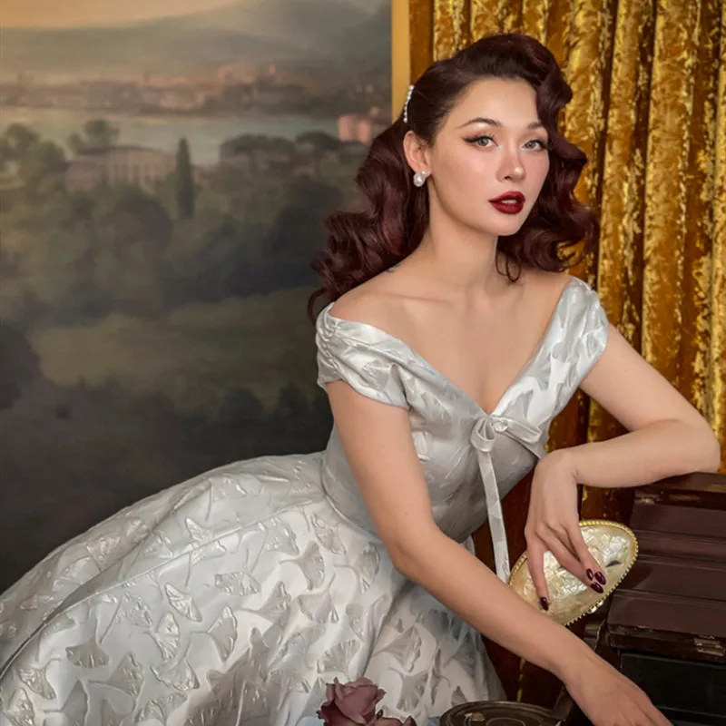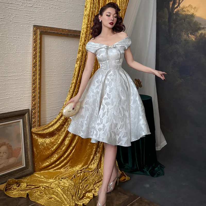 Le Palais винтажные 2021 летние новые оригинальные элегантные Серебристые жаккардовые атласные платья с открытыми плечами для женщин бальное платье с вырезом лодочкой