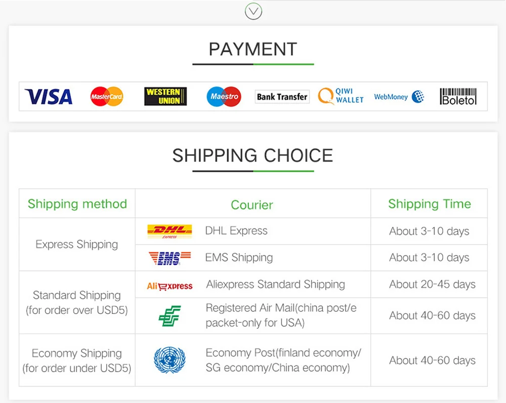 Место назначения:Россия Бесплатная EMS>$200США Бесплатная EMS/DHL >$200Другие страны, свободные EMS/DHL >$200Бесплатная доставка авиапочтой Бразилии, пожалуйста, свяжитесь с нами, если вам нужна Экспресс-доставкаВремя доставки и поиск на сайте:AliExpress Стандартная доставка: 20-45 днейВеб-сайт отслеживания: https://www.17track.net/enEMS:3-10 днейВеб-сайт отслеживания: http://www.ems.com.cn/english.htmlDHL:3-10 днейВеб-сайт отслеживания: http://www.cn.dhl.com/en.html(Строгая таможенная политика, напряженный сезон, плохая погода может задержаться)Уважаемые покупатели, мы гарантируем нулевой риск покупки.По каким-либо причинам вы не удовлетворены заказами, пожалуйста, свяжитесь с нами, прежде чем оставить отзывы или открыть спор.Мы сделаем все возможное, чтобы решить вашу проблему. Спасибо!1. Проблемы с качеством: если товар не соответствует описанию или поврежден при транспортировке, пожалуйста, сделайте четкие фотографии в течение 7 дней после получения и отправьте фотографии в сообщении о заказе. Мы предоставим вам возврат или замену после подтверждения.2. По любым другим причинам: по каким-либо причинам Вам не нравятся товары, пожалуйста, свяжитесь с нами в течение 15 дней после получения заказа, пожалуйста, убедитесь, что товары находятся в первоначальном состоянии и оплачиваете стоимость доставки самостоятельно. Мы обеспечим возврат средств илиЗамена после того, как мы получили возвращенную продукцию.3. Если вы удовлетворены нашими продуктами и обслуживанием, мы будем очень признательны, когда вы дадите нам пять звезд отзывы.Большое спасибо!