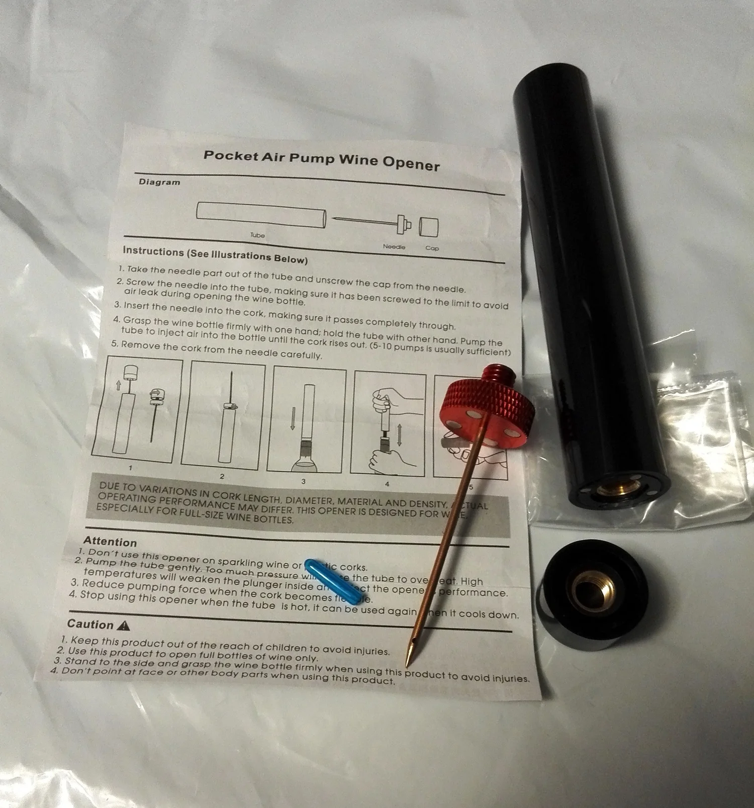 Заказ оформил 11.10.2021, доставили службой 5post в Самарскую область 23.10.2021. Упаковка - пакет. Товар соответствует описанию, инструкция - на английском языке. Штопор изготовлен качественно, выглядит красиво, легкий. Торцы штопора - серебристого цвета. Игла закрыта колпачком. Съёмная часть с иглой держится на основной части в походном состоянии на четырёх маленьких магнитах, в рабочем состоянии - на резьбе. Посторонних запахов нет. Работает по принципу воздушного насоса. Для извлечения пробки из бутылки, нужно привести штопор в рабочее состояние, проткнуть пробку иглой так, чтобы конец иглы с отверстием оказался ниже пробки, и сделать 3-4 качка. Протыкать пробку нужно вертикально, уверенно, но аккуратно, не ломая иглы. Разные пробки требуют разных усилий. Купил со скидкой за 298,54 ₽. Товар и продавца рекомендую.