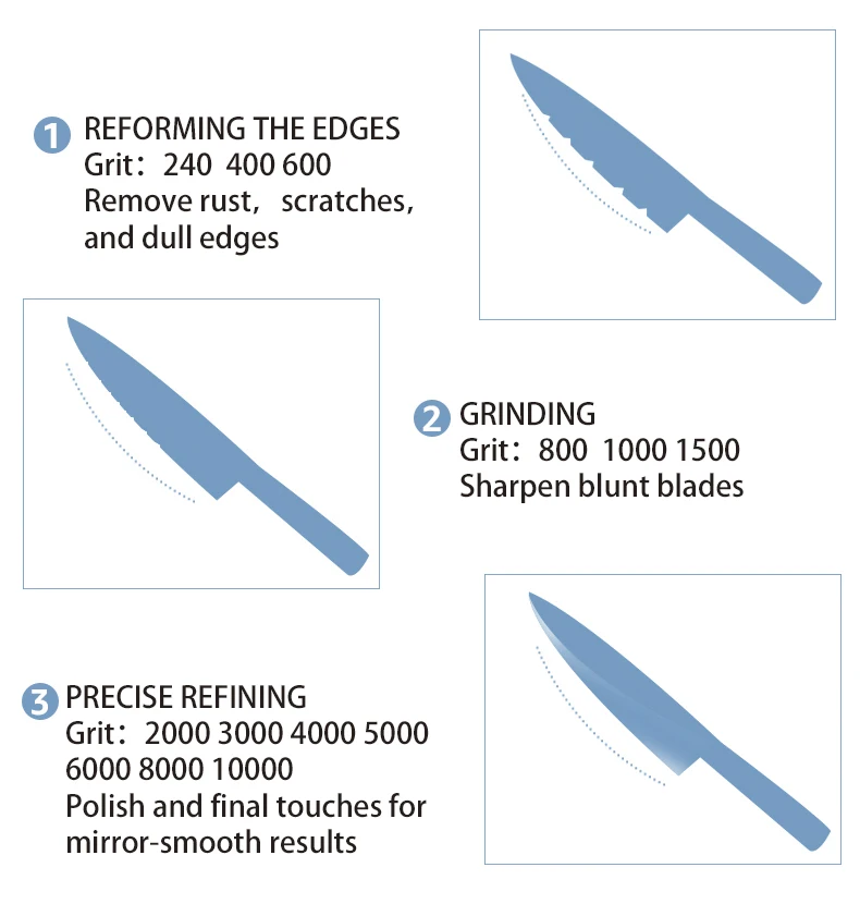 Шаг 1: Грубое шлифование, используется для ремонта тяжелого состаренного края плотины, подходит для тупых ножей. Удерживайте нож под углом 10 - 30 градусов, измельчайте кромку на поверхности камня с помощью давления на светильник и остывайте до тех пор, пока край не будет достаточно острым. После заточки инструмента его необходимо отшлифовать грубой шлифовкой через полтора года. Это также зависит от конкретной ситуации.