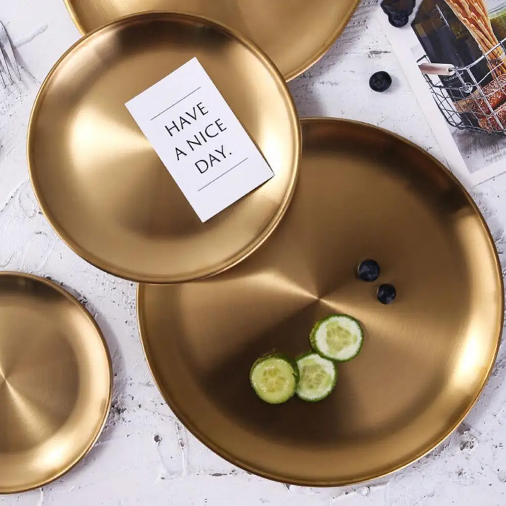 1 шт., Золотая круглая тарелка из нержавеющей стали, обеденные блюд...