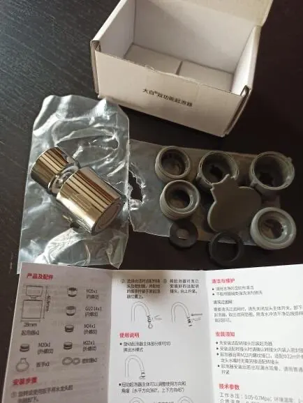 Отличная статья. Очень хорошо упакован. Все поставляется: Адаптер для всех кранов, ключ для затягивания этих адаптеров, уплотнений и даже пояснительной записки (на китайском, но с изображениями). Сам Совет очень хороший. Он сделан из металла, выглядит отлично, ориентируется и с 2 типами струй (классика и дождь). Мы легко проходим с одного на другой из струй, сделав небольшой поворот нескольких миллиметров. Это действительно очень хороший продукт.