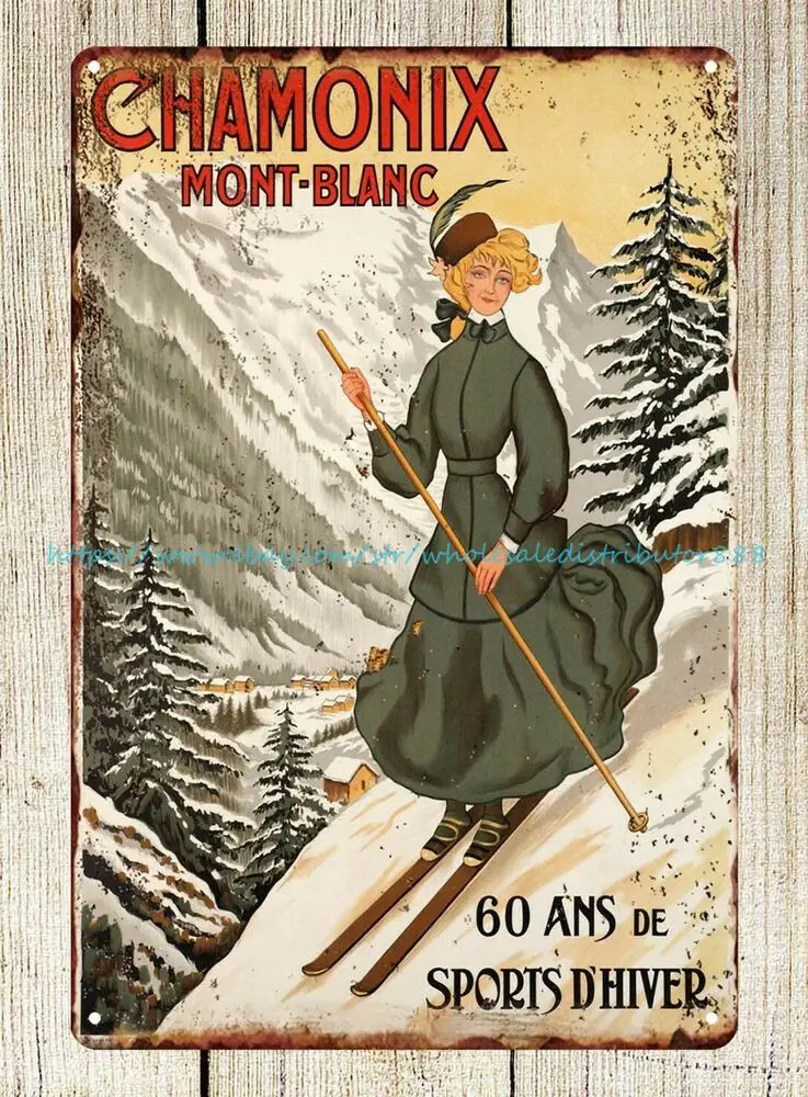 Chamonix, Mont-Blanc. 60 лет спорта зима 1962 оловянный знак плакат металлическое искусство