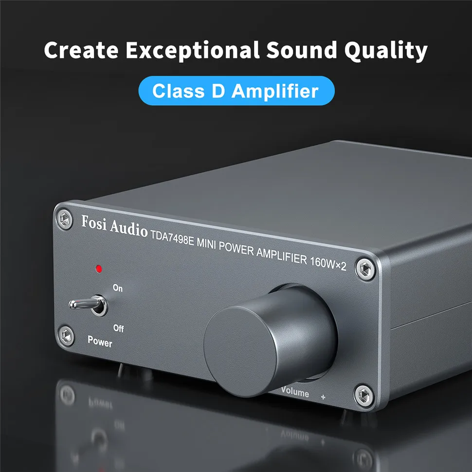 160 Вт X 2(4 Ом, 20 Гц-20 кГц, 0.04% THD), для наружной/книжной полки/компьютера/рабочего стола/потолка/напольных динамиков, можно использовать iPod, телефон, mp3-плееры, TV, Echo Dot, cd-плееры или потоковые медиаплееры в качестве входного сигнала.