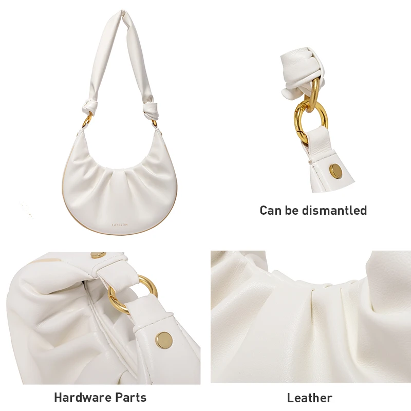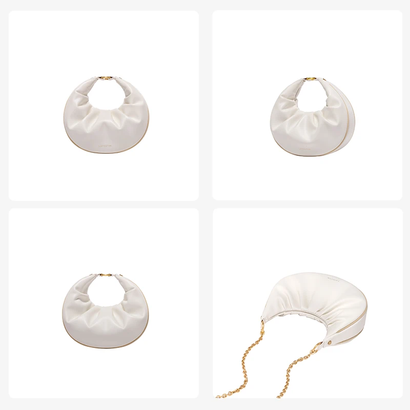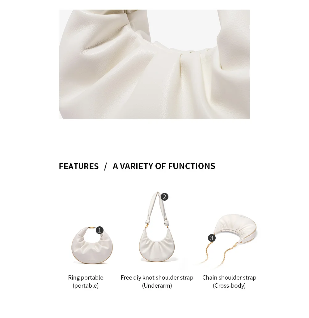 Форма сумки кольца и элементы плиссированного дизайна можно пристегнуть как маленькую сумочку, и ее можно заменить на сумку на подмышке с коротким плечевым ремнем с веревочным узлом, И длинный плечевой ремень с цепочкой можно заменить на сумку-мессенджер.