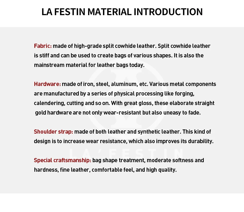 Каждая сумка, разработанная LA' FESTIN, всегда уделяет внимание как художественному ощущению, так и практичности.