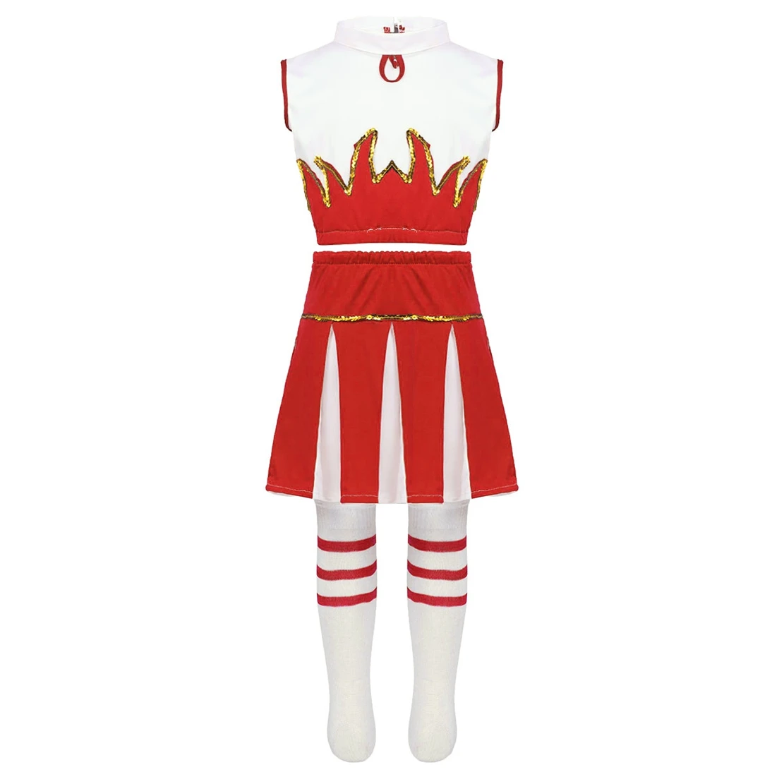 Особенности:Костюм изготовлен из полиэстера и спандекса, рекомендуется ручная стирка.Таблица размеров означает возраст для девочек, но только для общего руководства.Без рукавов, с ложным вырезом, с застежкой, топы спереди с замочком и блестками.Пара носков, плиссированная юбка с эластичным поясом со встроенными трусиками.Хороший выбор для нарядов, ролевых игр, сценических костюмов, карнавала, танцев, соревнований по танцам и т. д.