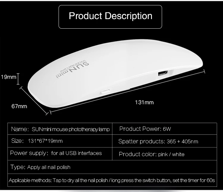 Объяснение:100% новинка, высокое качество.Это удобно и практично для вас. Подходит для занятий или семейного использования.Предназначен для маникюра, этот продукт может использоваться для сушки УФ-и светодиодного геля, не только для ваших ногтей, но и для ваших ногтей, чтобы обеспечить хороший эффект сушки.Применение: 1. Нажмите и удерживайте кнопку ВКЛ/ВЫКЛ в течение 1-2 секунд, чтобы включить или выключить устройство.2. Когда рука входит в машину, инфракрасный датчик запустится автоматически.3. Автоматически выключается при выходе, максимальное время работы по умолчанию составляет 45s / 60s4. Когда питание включено, индикатор горит.Стандарт:• Мощность: 6 Вт Световой потокРазмер продукта: 131*67*19 ммБусины для ламп: 6 шт./светодиодовТип: комбинированная светодиодная/УФ-лампаВ комплект поставки входят:1 * лампа для ногтей (без коробки)1 * usb1 * Инструкция по эксплуатацииПримечание:Из-за различий между различными мониторами, фотографии могут не отражать фактический цвет изделия.Пожалуйста, сравните размер детали с вашим размером. Из-за ручного измерения допускается погрешность в 1-3 см.Если есть проблема с продуктом, пожалуйста, свяжитесь с нами немедленно, и мы постараемся сделать все возможное, чтобы решить его для вас