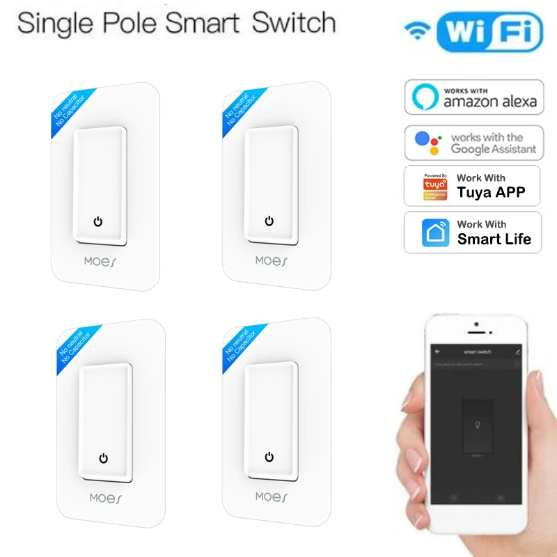 Умный кнопочный переключатель Tuya, Wi-Fi, без нейтрального провода, однополюсный, без конденсатора, поддержка приложения Smart Life, Alexa, Google Home
