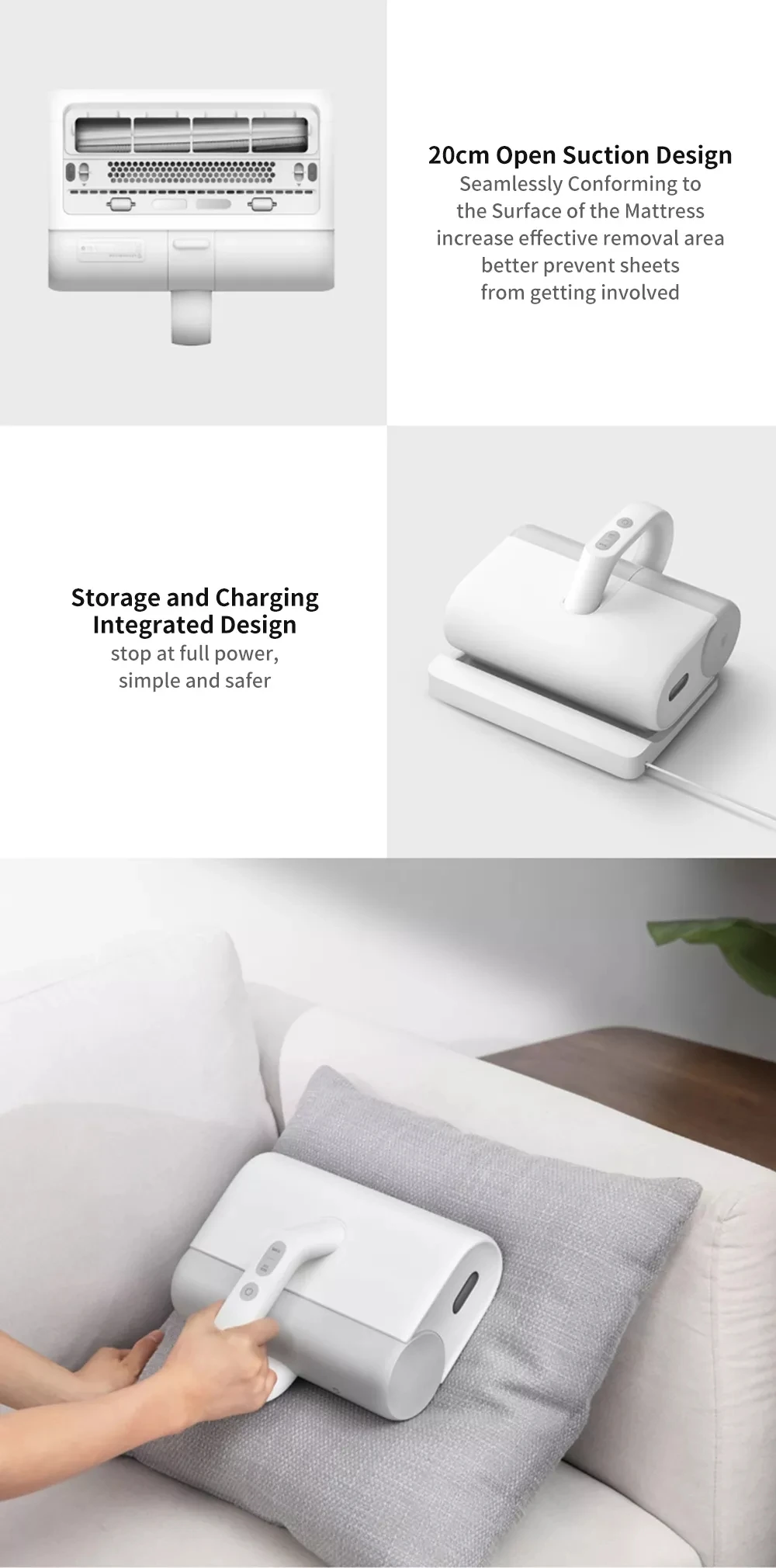 Нижняя часть фюзеляжа имеет большую контактную поверхность, вес равномерно опускается, и он плавно облегает поверхность матраса, увеличивая герметичность всей машины и матраса. В то же время 20 см открытое всасывающее отверстие может эффективно предотвратить задействование простыни и обеспечить наилучший эффект всасывания.