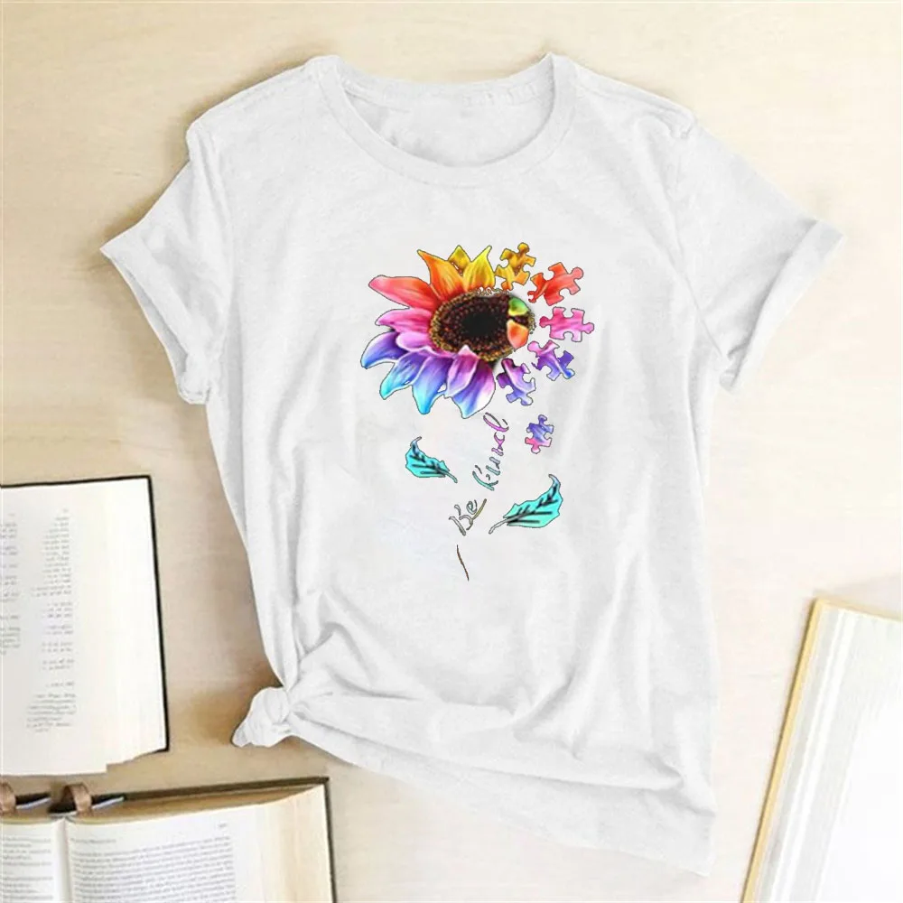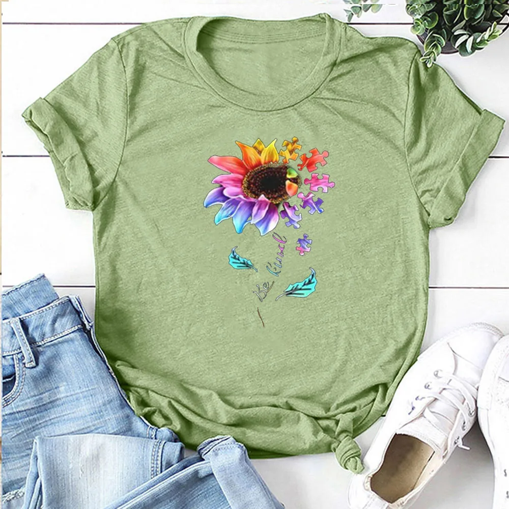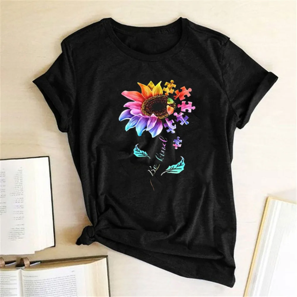 Женская футболка с цветочным принтом Be Kind, летняя свободная футболка с коротким рукавом, Повседневная Уличная одежда с круглым вырезом для женщин, Ropa Mujer