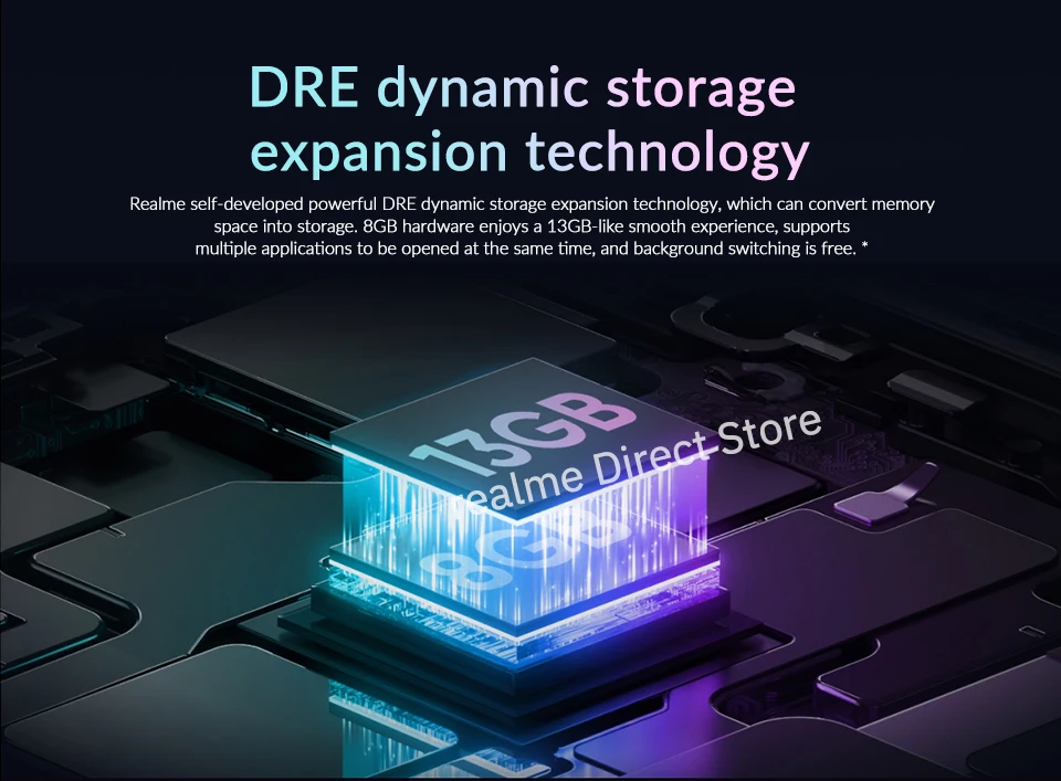 Realme самостоятельно разработанная мощная технология динамического расширения памяти DRE, которая может преобразовать пространство памяти в хранилище. 8GB hardware имеет 13gb-как плавный опыт, поддерживает несколько приложений, которые будут открыты одновременно, и фоновая коммутация бесплатна. *