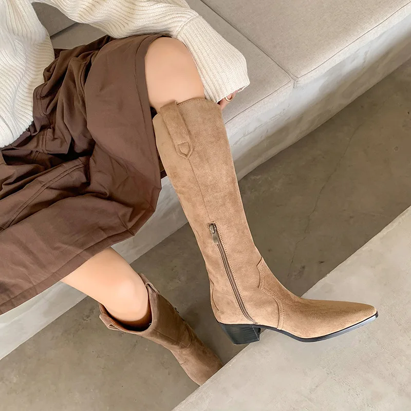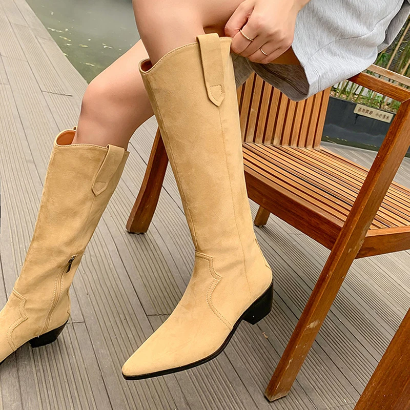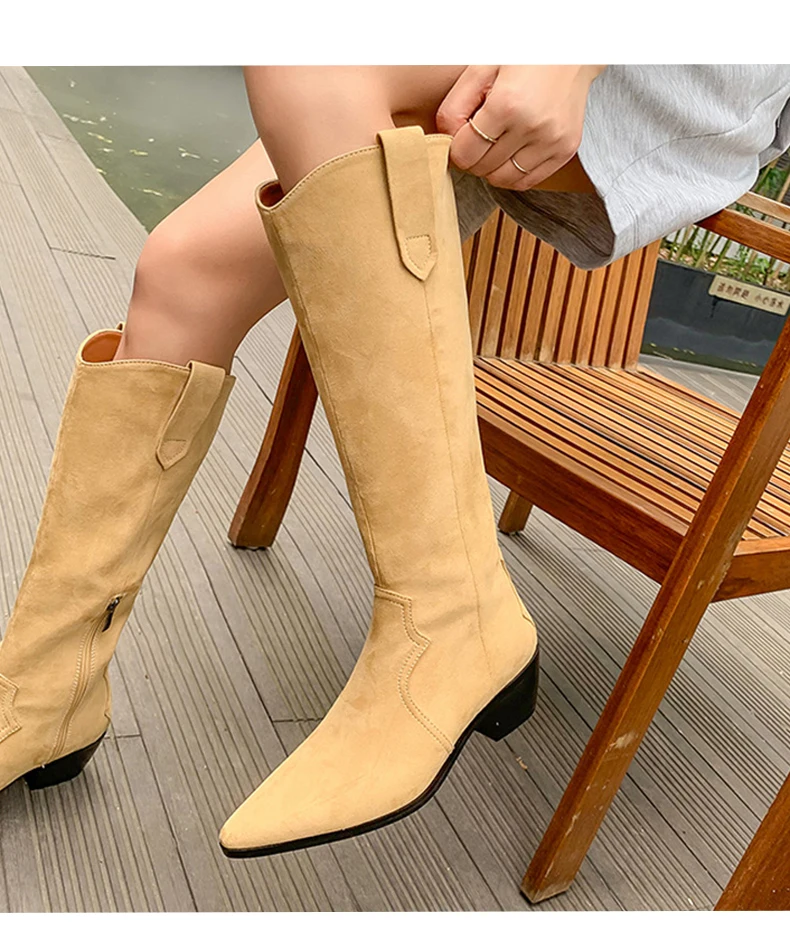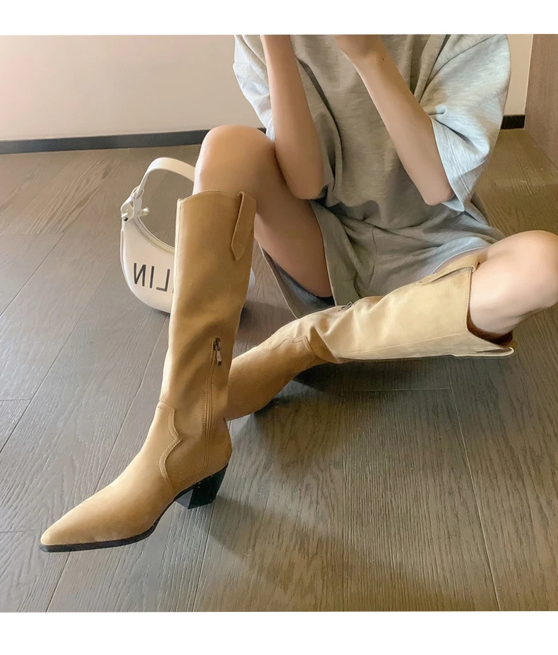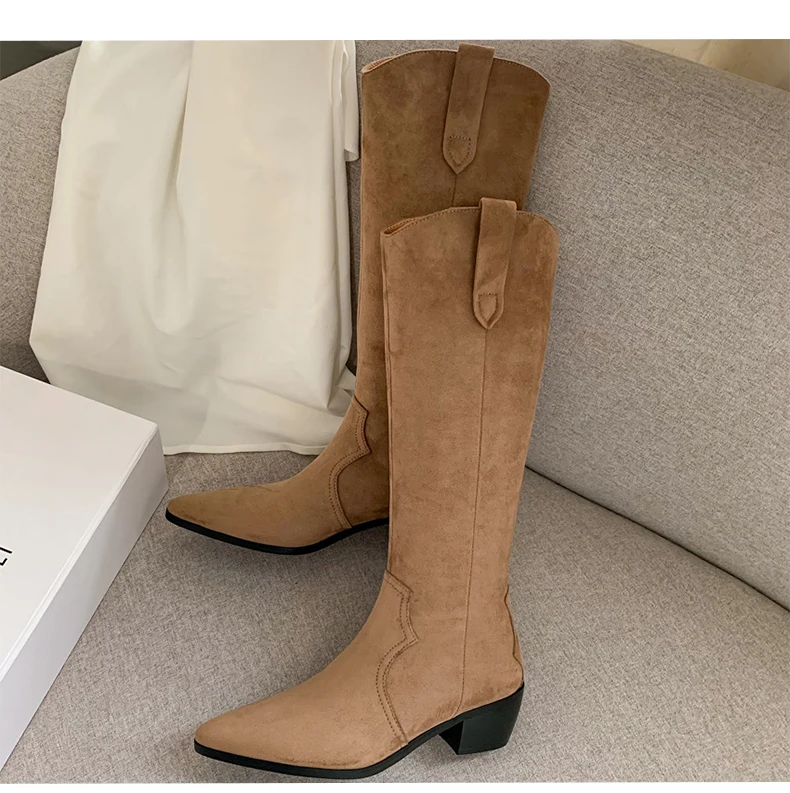 Сапоги женские коричневые из коровьей замши, на толстом каблуке, с острым носком, Осенние, ковбойские, 2021
