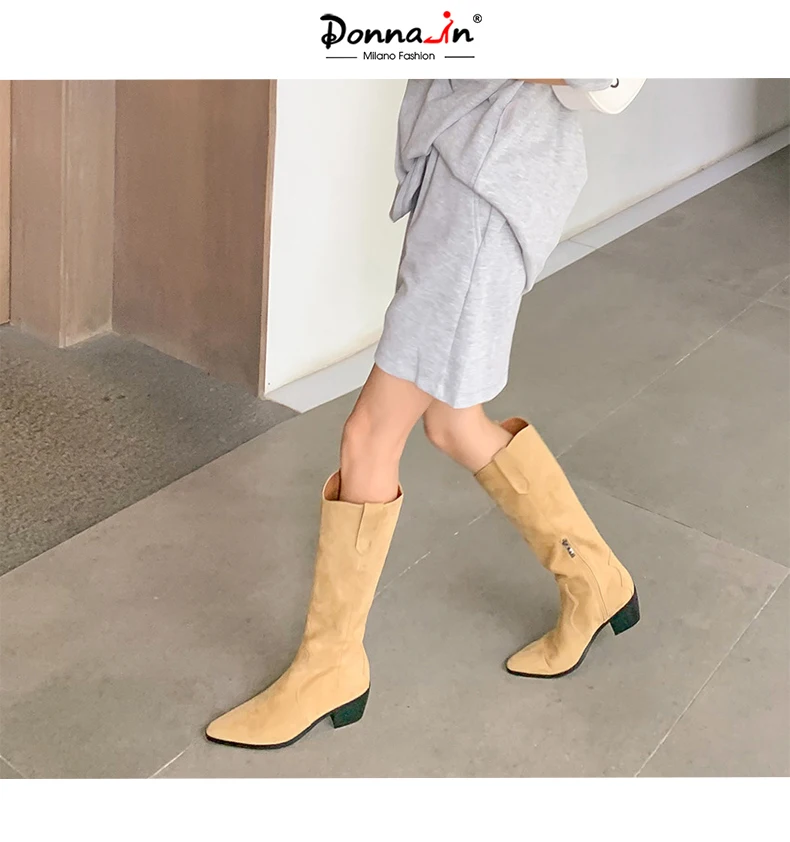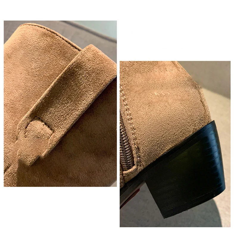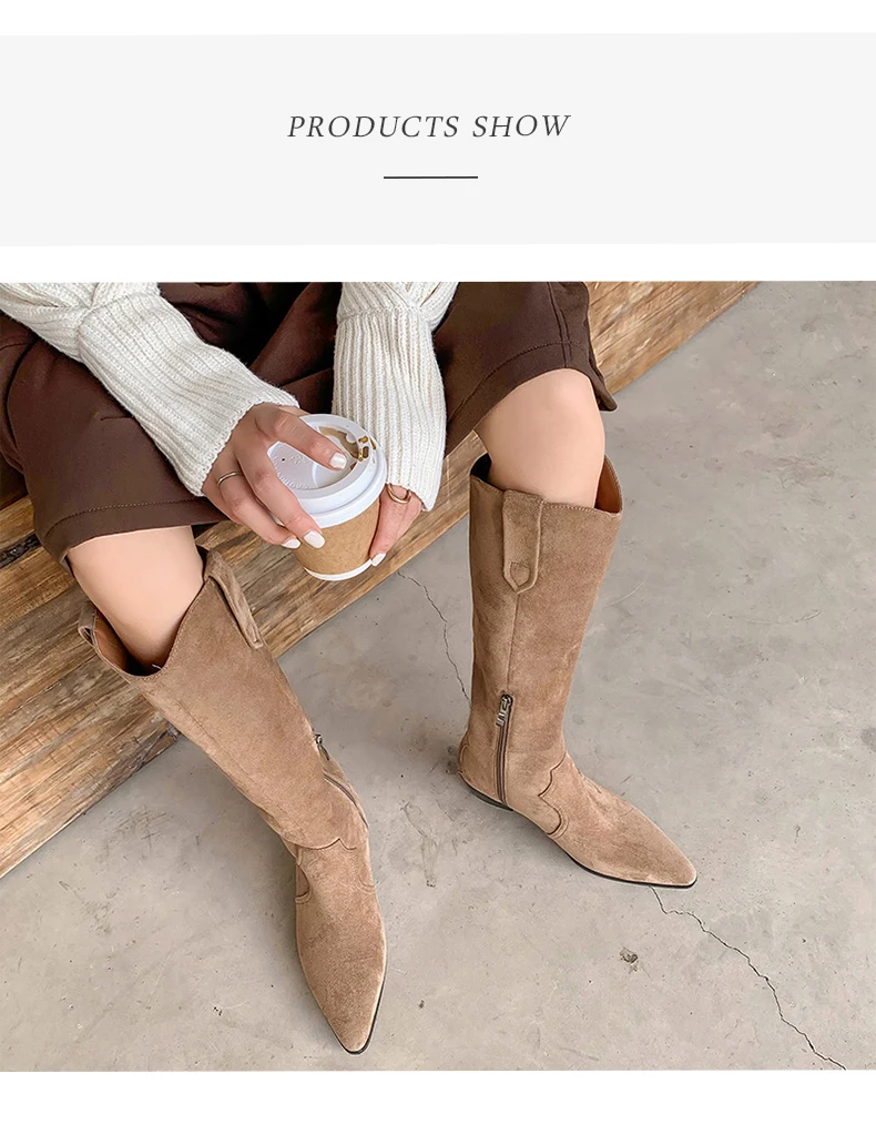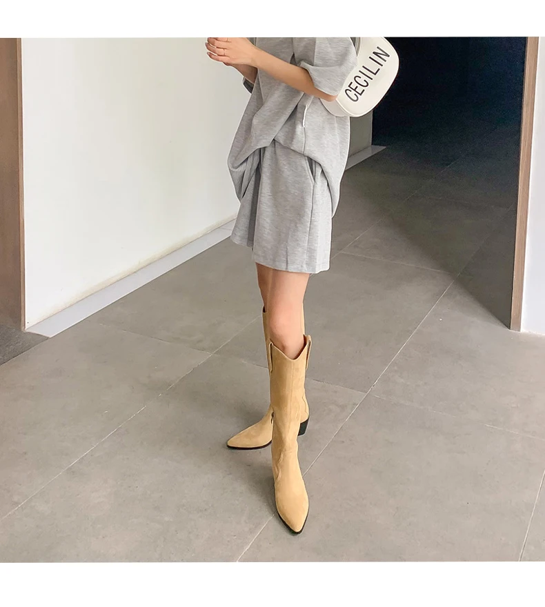 Сапоги женские коричневые из коровьей замши, на толстом каблуке, с острым носком, Осенние, ковбойские, 2021