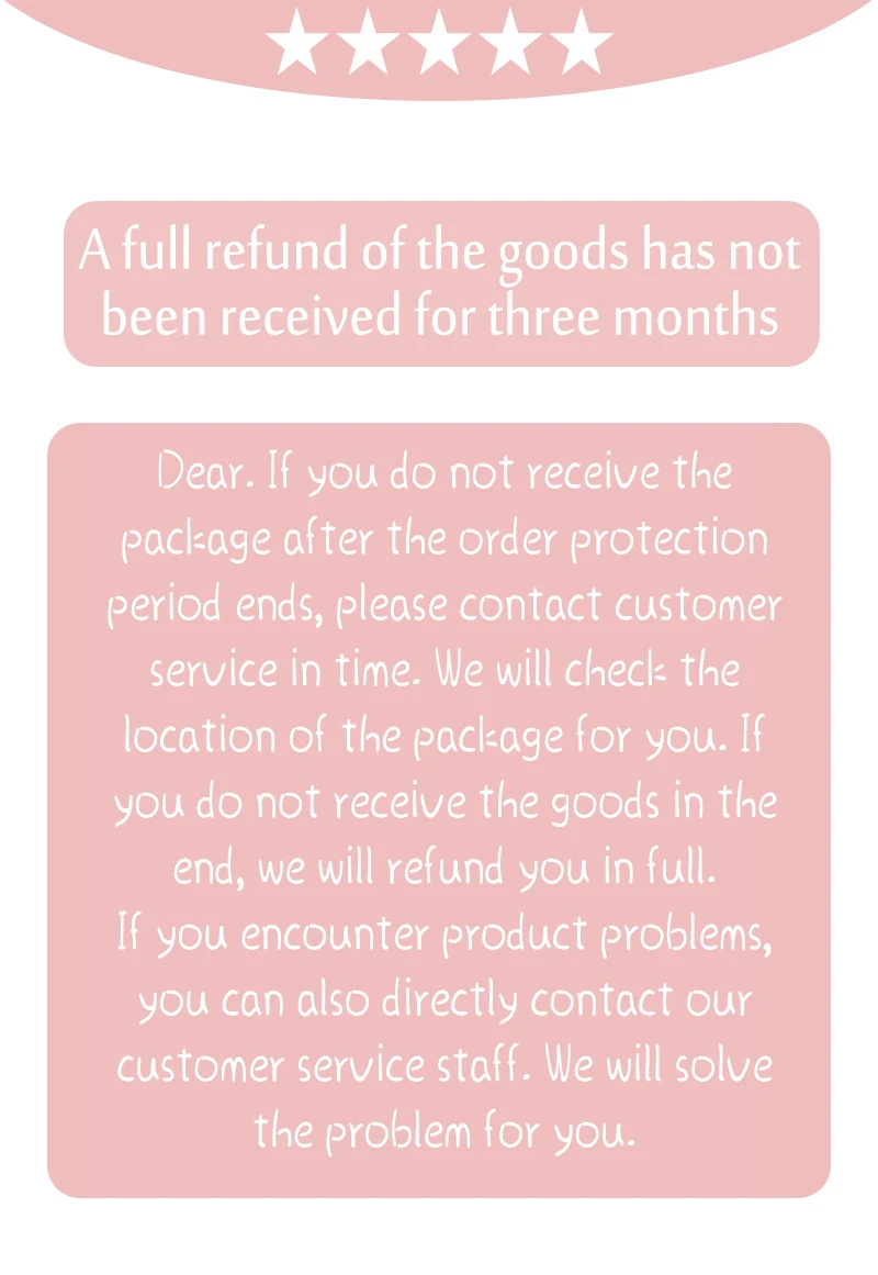 Дорогие друзья. Если вы обнаружили, что товар имеет проблемы с качеством или не удовлетворен товаром, вы можете вернуть его в любое время после получения товара. Понесенные расходы будут нести мы. (В течение 15 дней после получения товара) (В настоящее время поддерживаются только страны и продукты, которые поддерживают бесплатный возврат, поддерживаемый AliExpress) Если вы не получили посылка ЛКУ после окончания срока защиты заказа, пожалуйста, своевременно свяжитесь со службой поддержки клиентов. Мы проверим местоположение посылка для вас. Если вы не получите товар, мы вернем вам деньги в полном объеме.