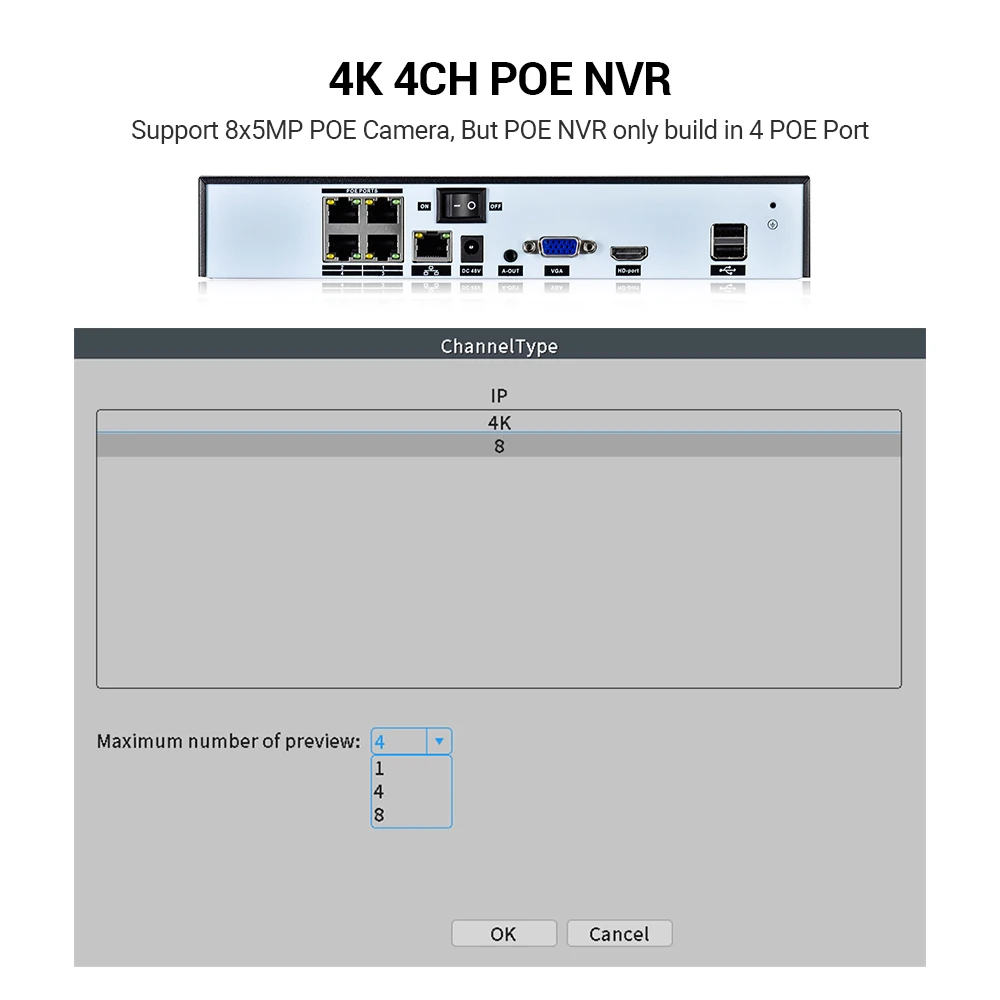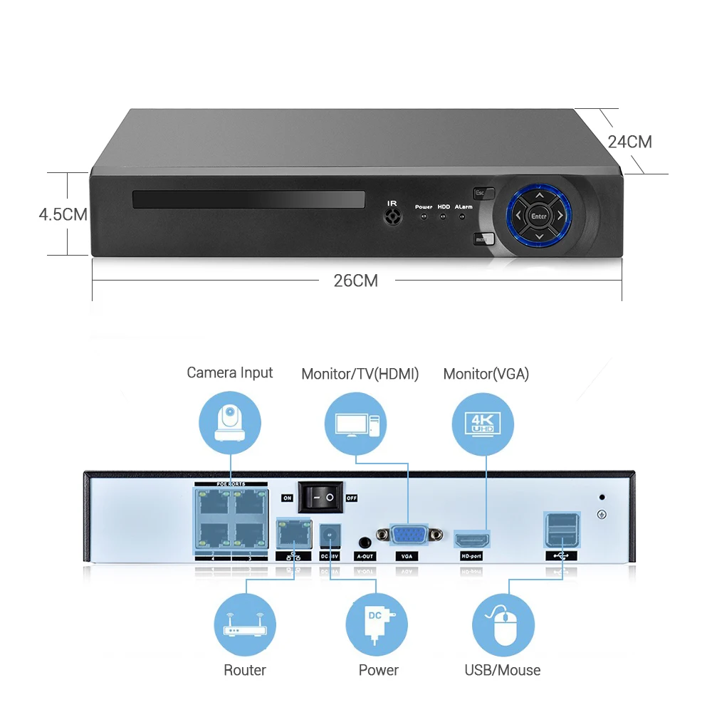 Операционная система: Встроенный LinuxСжатие видео: H.264/H.265Видео вход (IP) : 4*4KВидеовыход: HDMI, VGAСетевой интерфейс: RJ45HDD: 1 * SATA порт (поддержка до 6 ТБ)Удаленный просмотр P2P: Поддержка iOS, AndroidДоступно 20 языков: русский, английский, итальянский, португальский, испанский, французский, немецкий и т. Д.Обнаружение движения: поддерживаетИсточник питания: POE 48VРазмер: 26 см * 24 см * 4,5 смПосещение удаленно облаком или приложением XMEye