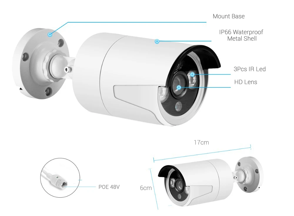 Датчик изображения: 1/3 "4MP/8MP CMOSПочтовый поток: 8 Мп: 3840*2160P4 МП: 2560*1440PВстроенный микрофон, поддержка аудиозаписи3 шт. Массив светодиодный ИК расстояние до 20 мПо умолчанию 2,8 мм мегапиксельная линзаМощность: POE 48 вМеталлический корпус, стандарт IP66 водонепроницаемый