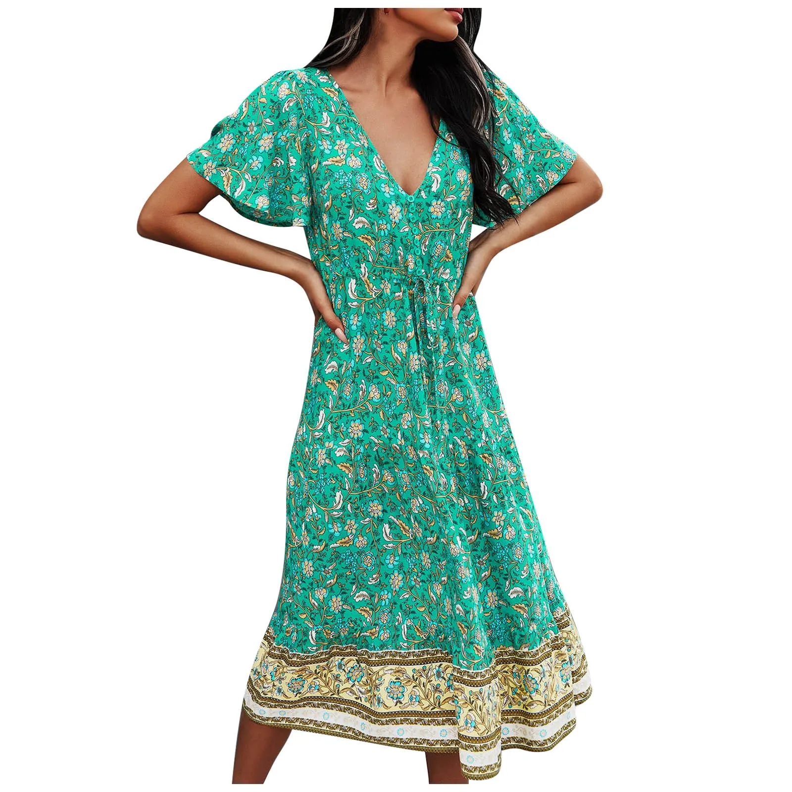 Женское повседневное модное платье с V-образным вырезом, длинные платья в стиле бохо с принтом на талии и коротким рукавом, элегантное женское платье с рукавом-фонариком, 2021