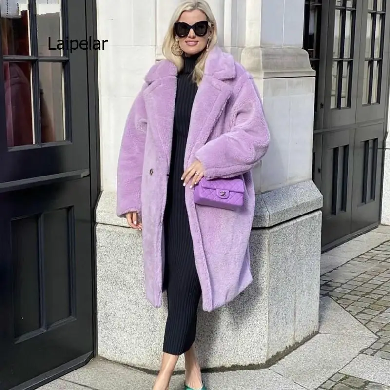 Зимнее стильное пушистое пальто с отложным воротником из искусственного меха пушистая длинная куртка фиолетовая Женская дубленка пушистые длинные куртки сохраняют тепло верхняя одежда