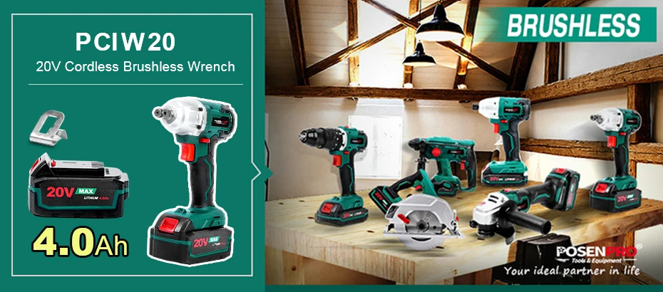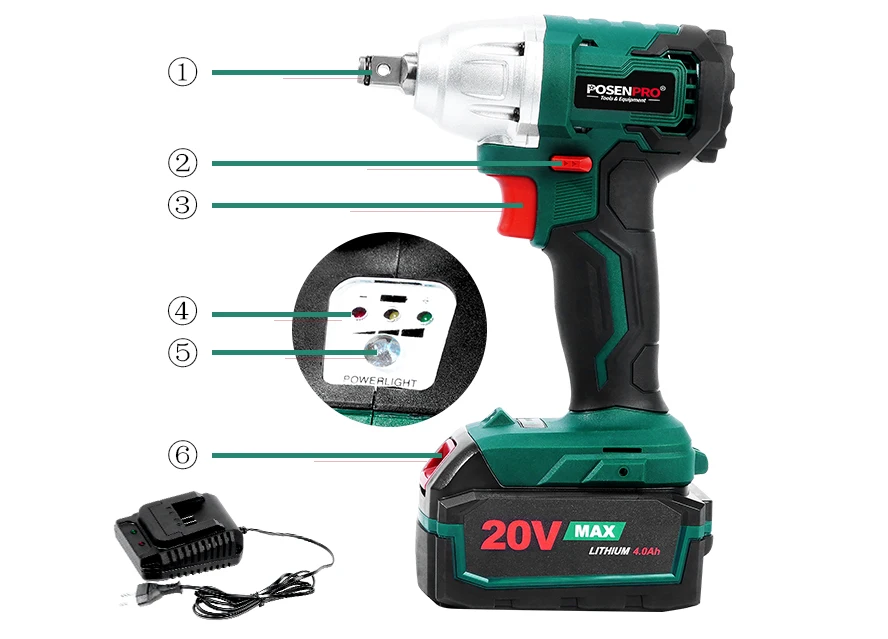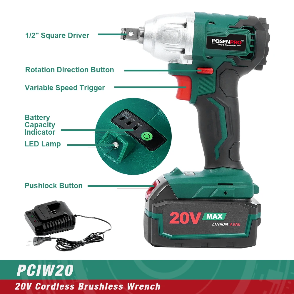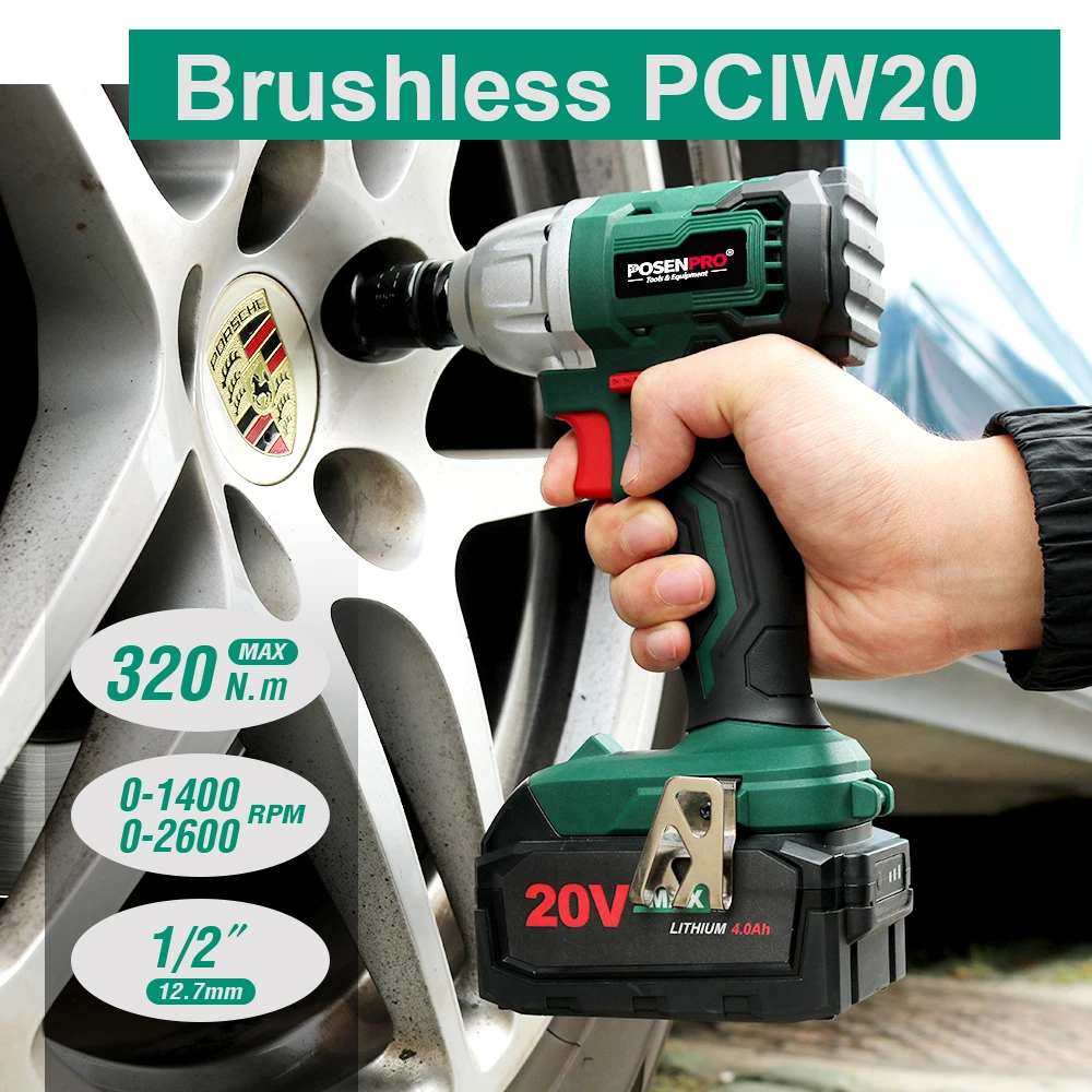 POSENPRO PCIW20 бесщеточный ударный ключ, с бесщеточным двигателем конфигурации, этот набор ударных гаечных ключей идеально подходит для легкого вождения гайки втулки и удаления гайки втулки. Легкие инструменты, разработанные в соответствии с потребностями пользователей, Мягкая рукоятка для дополнительного комфорта и полного контроля без сильной усталости во время использования. Питание от 20 напряжения, 4.0AH литий-ионный аккумулятор для сильной и устойчивой мощности и длительного времени работы, который поставляется с зарядным устройством, простой и удобный для зарядки. Светодиодные лампы обеспечивают повышенную видимость в темноте или в ограниченном месте для работы. Компактная конструкция инструмента с двухскоростными настройками, Скорость без нагрузки (0-1400/0-2600 об/мин) И 320N.M крутящего момента делает даже сложных работ проще.