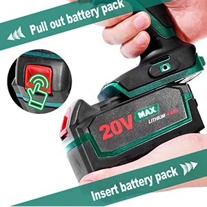 Мощная литий-ионная батарея 20 в макс. Ач достигает полного заряда всего за 1 час. Обеспечивает непрерывное питание для удовлетворения более длительных рабочих потребностей. Установите батарейный блок на зарядное устройство. Загорится красный светодиод, указывающий на то, что аккумулятор заряжается. После завершения процесса зарядки красный светодиод гаснет и зеленый светодиод будет постоянно гореть. Время полной зарядки пустого аккумулятора составляет приблизительно 2 часа.