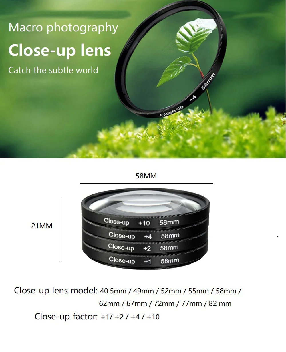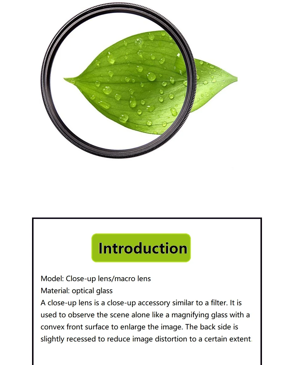 Этот набор макрофильтров идеально подходит для фотографирования мелких предметов, таких как детали цветов, монет, насекомых и т. д. каждая линза крупного плана поддерживает разрешение и четкость изображения, увеличивая при этом размер изображения.