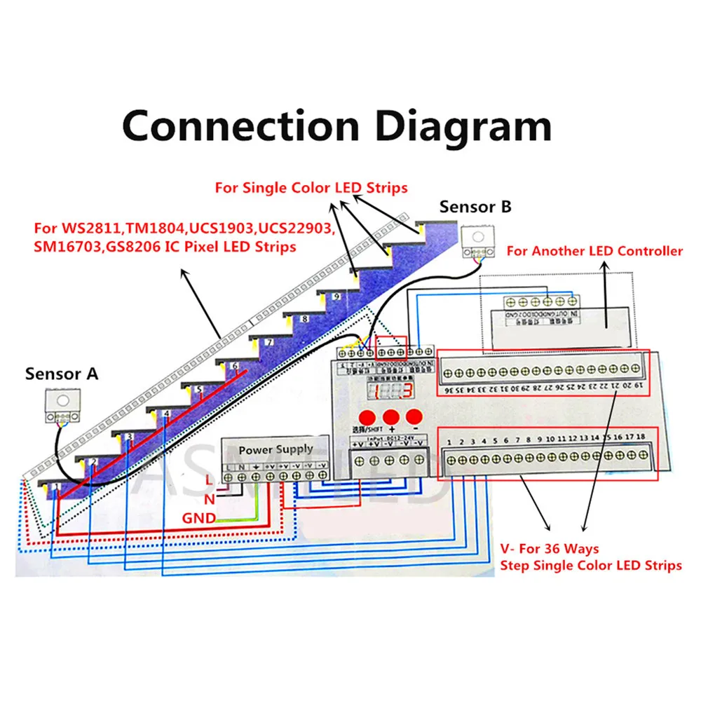 Светильник для лестницы, 36 каналов, DC 12V 24V, двойной датчик движения, лестничный светильник, лестничная лестница, чувство, шаг управления для Dream Color Strip