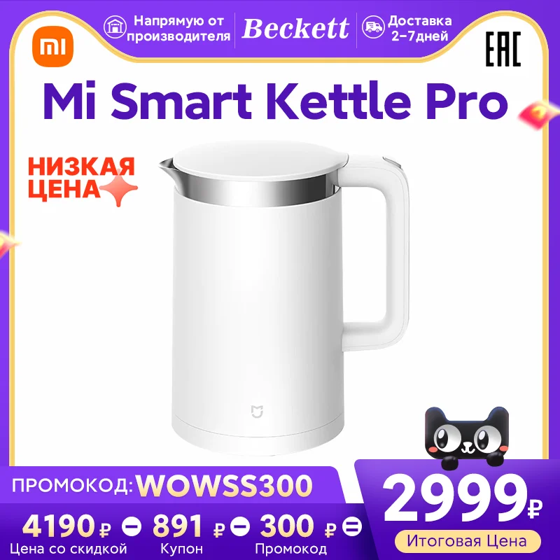 Доставка за 3 дня. Отличный чайник. К умному дому не подключить. В приложении можно установить только поддержание температуры. Работает тихо, не шумит. Внешне не нагревается сильно (рукой можно свободно дотронуться)