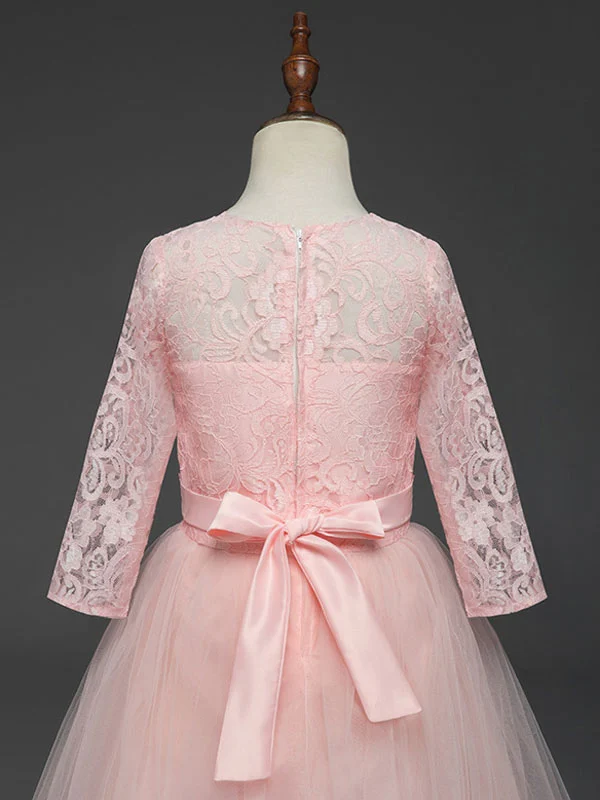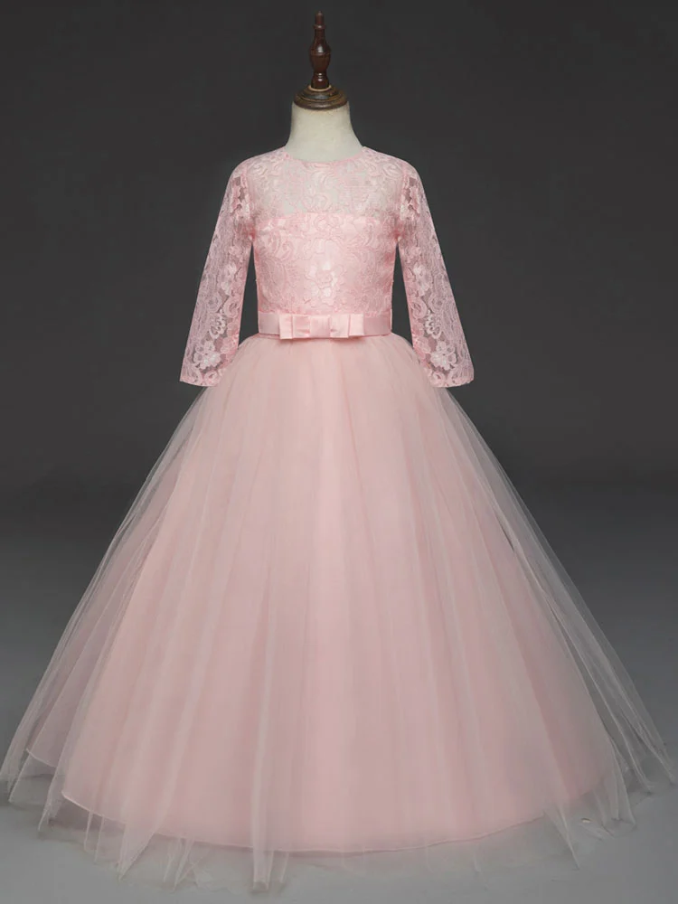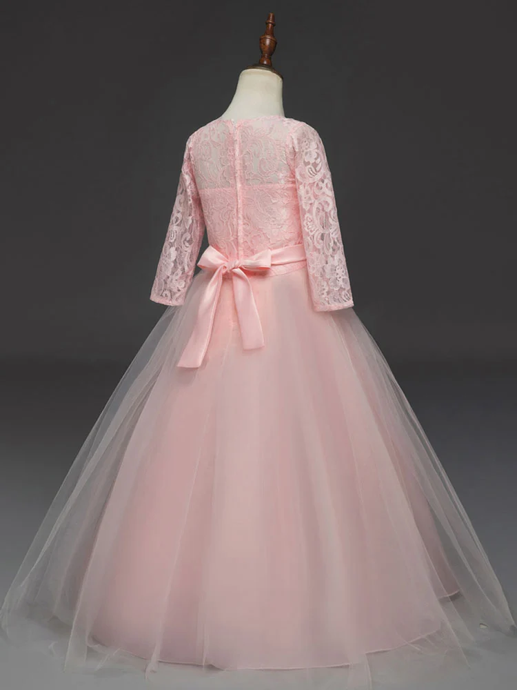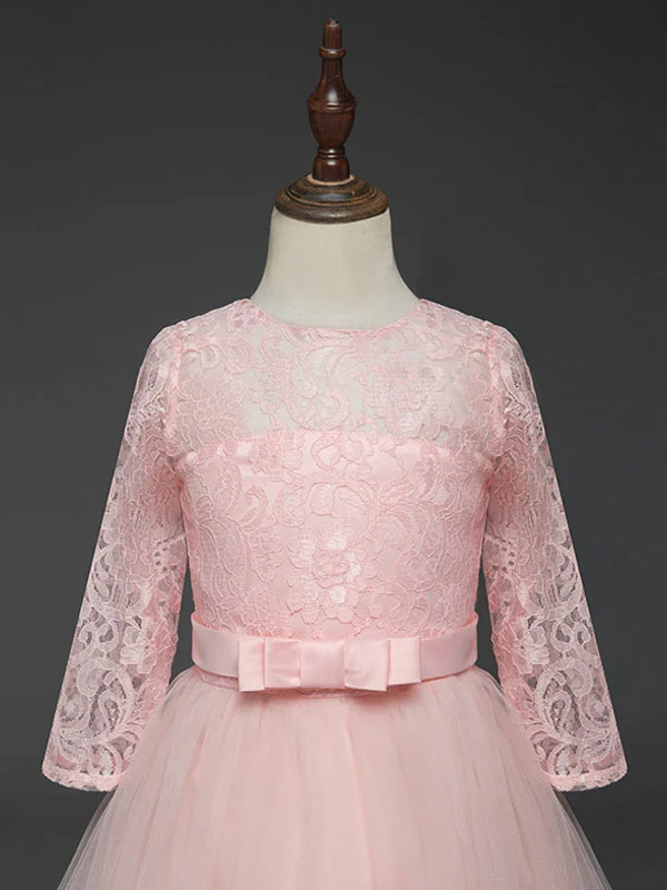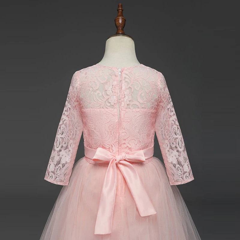 Детское платье с длинным рукавом, кружевом и бантом на талии
