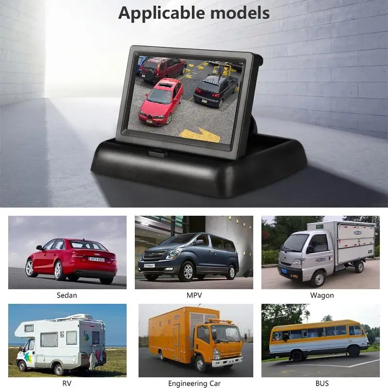 Автомобильная камера заднего вида 4,3 дюймов Автомобильный монитор заднего вида для парковки Особенности: 1. Система мониторинга заднего вида может помочь вам повернуть назад или парковаться. 2. Полноцветный TFT LCD 2-КАНАЛЬНЫЙ AV видео вход вид спереди или вид сбоку, низкое энергопотребление. 3. Профессиональная Водонепроницаемая Автомобильная камера заднего вида ночного видения. 4. Подключите монитор к шнуру питания, а затем Подключите камеру к монитору в соответствии с инструкцией по эксплуатации. 5. Нет аудиовхода или выхода, совместимость NTSC/PAL 6. Нажмите кнопку, чтобы сложить дисплей 7. Он питается от подключения питания транспортного средства и используется для установки на нижней стороне клея приборной панели Характеристики продукта: Название продукта: 4,3 дюймов ЖК-дисплей складной дисплей Цвет изделия: черный Размер изделия: примерно 4,3x5,25x4,25 дюйма (высота x Ширина x глубина) Материал корпуса: АБС-пластик Экран Размер: 4,3 дюйма TFT 16:9 Экран. Разрешение: 800x480 Стандарт: PAL/NTSC Видео вход: AV1/AV2 Рабочий Источник питания: 9-24 В постоянного тока Потребление тока: 3 Вт (максимум) Рабочая температура: -20 ~ 50 градусов Цельсия Температура хранения: -30 ~ 70 градусов Цельсия Яркость экрана: 300 нит Контрастность: 250:1 Упаковочный лист: 1x4,3 дюймов дисплей 1 х шнур питания Посылка Вес: 250 г
