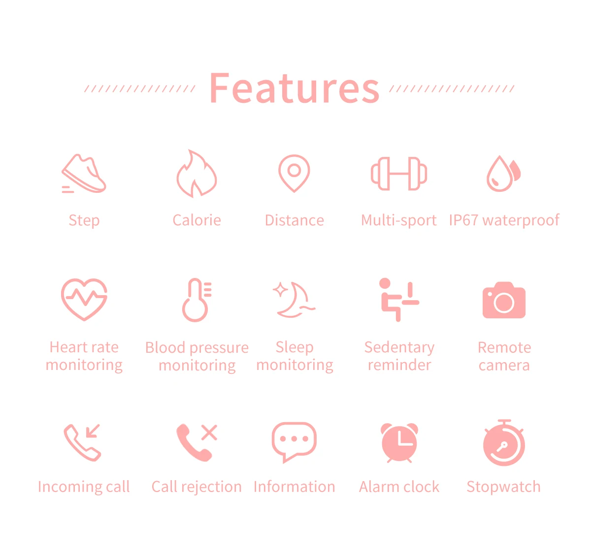 С 1,04 дюймовым tft-экраном 24 часа непрерывное обнаружение сердечного ритма, тест кровяного давления, Точное обнаружение сна Отображение времени/часов, шаг, калории, расстояние, сон, камера, включение/выключение дисплея Спортивный режим Монитор кислорода в крови Разумно предсказать менструальный цикл Мониторинг сна (время сна, качество сна, поздняя задержка) Напоминания о звонках, SMS напоминание, qq напоминание, микро напоминание, Skype, facebook, whatsApp напоминание. Найдите телефон и найдите браслет Будильник/напоминание о сидячем положении Один ключ измерения пульса и кровяного давления Камера дистанционного управления (встряхните, чтобы сделать фотографии) Язык поддержки: китайский, японский, английский, французский, немецкий, итальянский, испанский, русский, португальский, корейский, арабский, Вьетнам Синхронизация приложений Android и Apple: H Band Android версии 4,4 или выше; iOS версии 8,0 или выше; Поддержка bluetooth версии 4,0; BLE 4,0 NRF52832 PD70 140 мАч Встроенный, вибрационное напоминание IP67 G-sensor