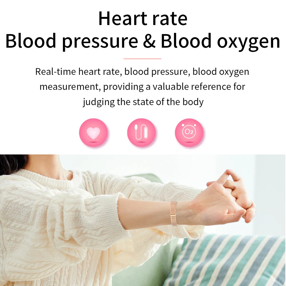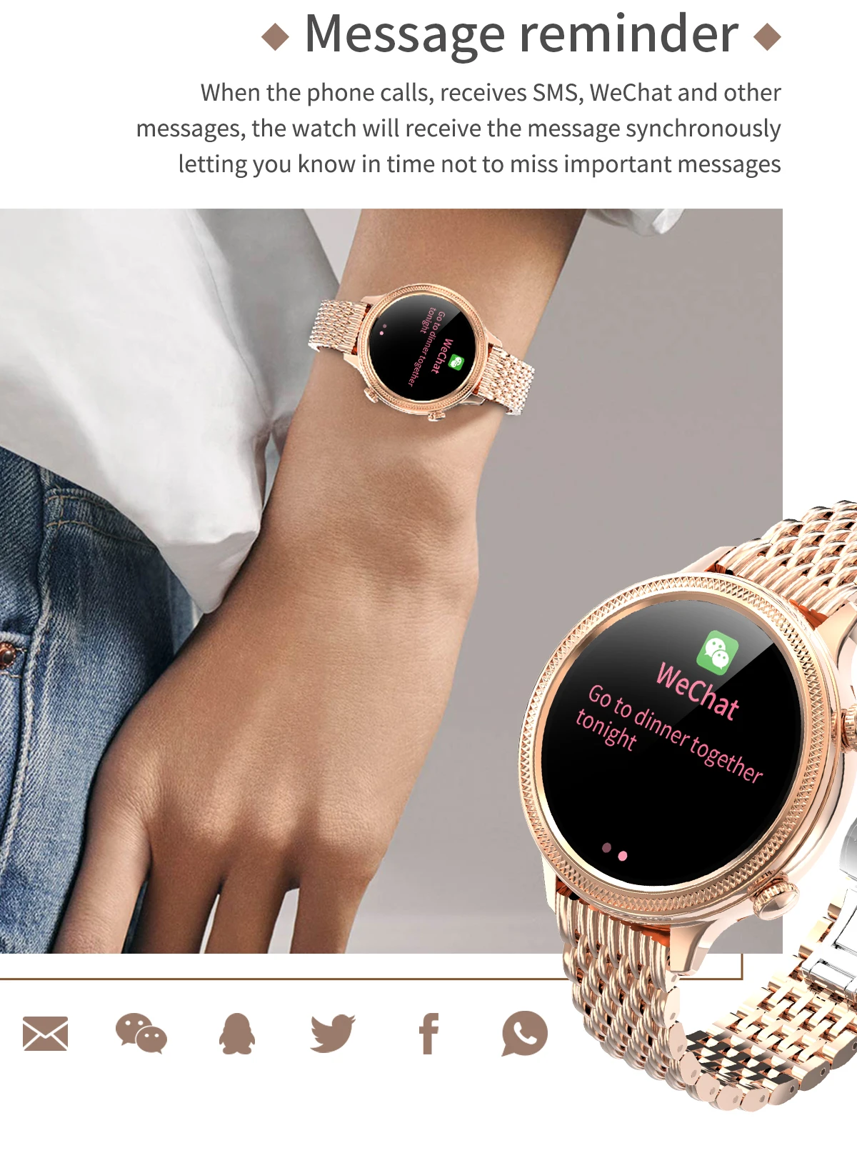Полный сенсорный экран/круглый smart watch с 1,1 дюймов IPS экран Resolution240 * 240 24 часа непрерывного обнаружения пульса, контроля артериального давления, оксиметрии, теста сна Отображение времени/часов, шаг, калории, расстояние, сон, камера Предполагаемый физиологический период для женщин Металлический корпус + Миланская лента Мониторинг сна (время сна, качество сна) Напоминания о звонках, напоминания о SMS, напоминания о qq, Wechat и другие напоминания о приложениях. Спортивный режим: ходьба, бег, туризм, плавание, баскетбол Будильник, напоминание о сидячем положении, найти браслет Камера дистанционного управления (встряхните, чтобы сделать фотографии) Китайский, традиционный китайский, английский, японский, немецкий, русский, испанский, итальянский, французский, португальский, польский Китайский, традиционный китайский, английский, японский, корейский, немецкий, русский, испанский, итальянский, французский, португальский, арабский, чешский, греческий, персидский, голландский, польский, финский, шведский язык, тайский Синхронизация приложений на базе Android и Apple: FitCloudPro