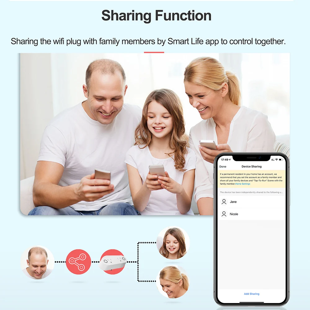 Используйте свой смартфон или планшет, чтобы дистанционно управлять смарт-вилкой wifi через бесплатное приложение smart Life или TuyaSmart в любое время и в любом месте. Легко Управляйте бытовой техникой.