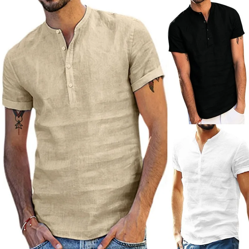 Мужская льняная футболка на пуговицах, однотонная Повседневная хлопковая Свободная рубашка с коротким рукавом и круглым вырезом, на пуговицах, лето 2021