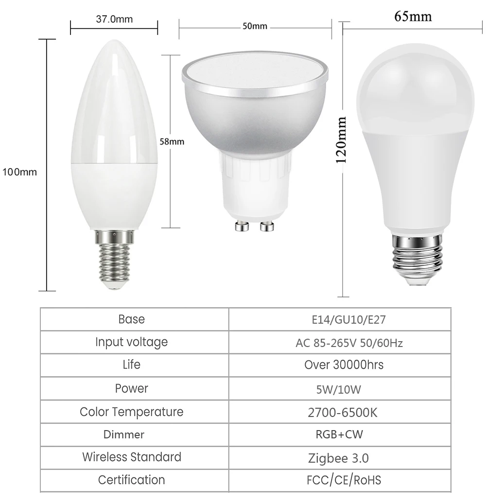 Стандарт: GU10/E27/E14Мощность: E27 10 Вт; GU10/E14 5 ВтВходное напряжение 85-265 В переменного токаСрок службы: более 30000 часовЦветовая температура: 2700-6500KСветовой поток: GU10/E14:500 люменовE27:900 люменов и подБеспроводной стандарт: Zigbee 3,0/домашний помощникСертификация: FCC/ CE / RoHS